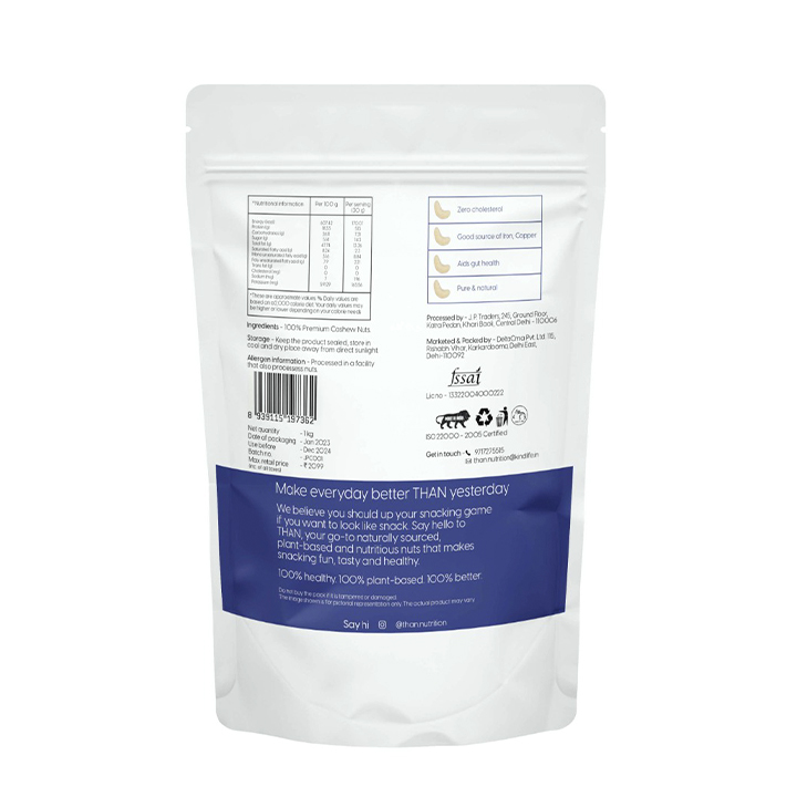 Indulge in the irresistible texture and nourishing qualities of THAN Crunchy Cashews. Order a pack today to experience a snack that not only satisfies your cravings but also supports your body's well-being. We meticulously source our cashews from top suppliers, ensuring exceptional quality. Each cashew is carefully chosen for its plumpness and flavor, guaranteeing an irresistible taste that will leave you wanting more. With up to 2 grammes of protein per serving, Than Crunchy Cashews are a rich source of this essential nutrient. Protein plays a vital role in maintaining and repairing your body's tissues, promoting muscle growth, and providing enduring energy. Our cashews are packed with heart-healthy monounsaturated fats, essential vitamins, minerals, and antioxidants. This wholesome combination contributes to your overall well-being and provides a nutritious boost to your daily diet. The blend of protein, healthy fats, and fiber in THAN Crunchy Cashews delivers a satisfying snacking experience that keeps you fueled and focused, making them an ideal option for a quick energy boost on the go.