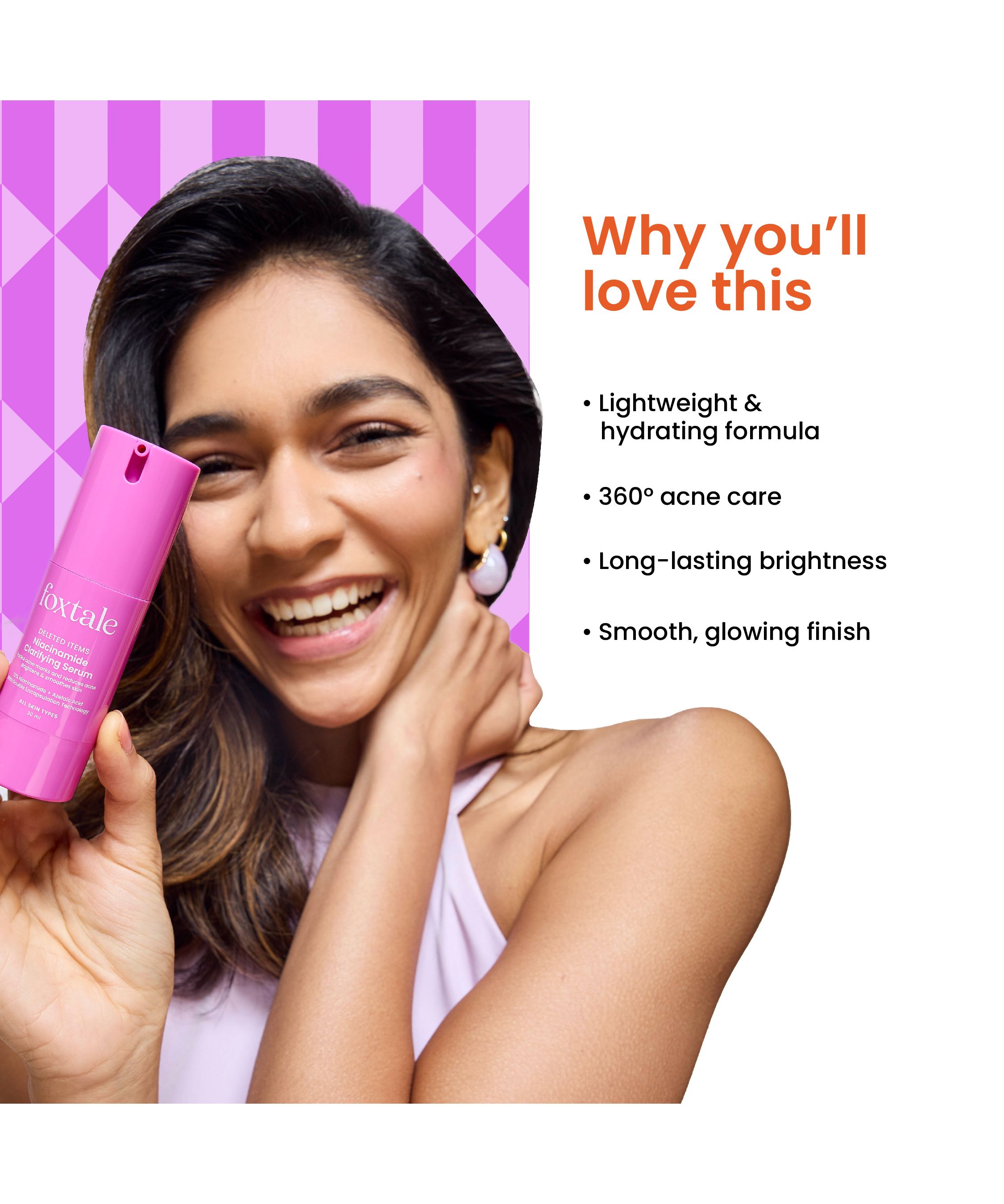 Delete 7 signs of acne, blemishes and pigmentation in 14 days and make space for clear, glowing skin! Powered by 12% Niacinamide and Azelaic Acid using Double Encapsulation Technology, this clarifying serum targets 7 signs - excess oil, clogged pores, blackheads, bumpy texture, redness, pigmentation, and acne marks, to make way for clear, bright skin! Its non-sticky lightweight formula absorbs quickly without clogging pores, minimizing their appearance making it ideal for skin types prone to acne and blemishes.