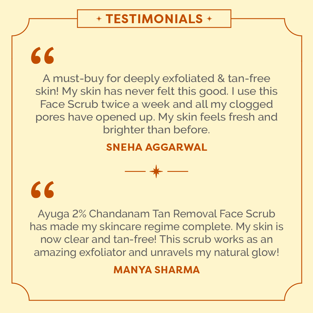 Embark on an all-natural journey to tan-free skin with age-old Ayurveda. Introducing 2% Chandanam Tan Removal Face Scrub, for a naturally glowing skin. Derived from the time-tested Ayurvedic formula, the 2% Chandanam Tan Removal Face Scrub is enriched with 2% Chandanam Oil containing Sandalwood, Fullers Earth, and 26 precious herbs. It exfoliates the skin, fades tan and reduces dark spots. It is a mild, cream-based formula that deeply cleanses your skin while retaining its moisture.
