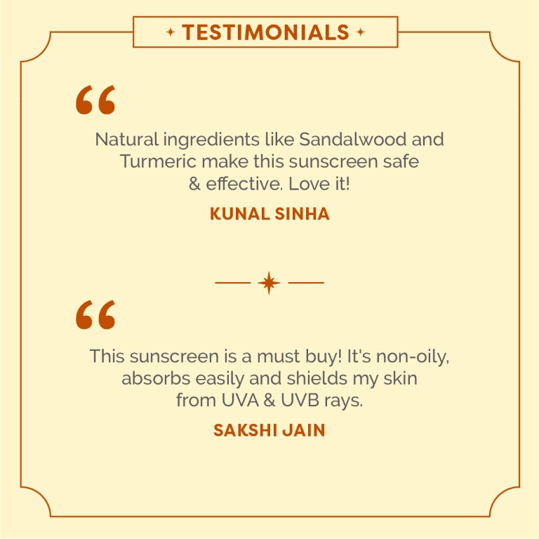 Be sun safe with the power of tradition! Introducing 2% Chandanam Skin Brightening Sunscreen to keep your skin protected. Packed with SPF 50 and PA+++ protection, this Ayurvedic sunscreen shields your skin from harmful UVA and UVB rays, keeping sun damage at bay. Enriched with 2% Chandanam Oil containing natures best ingredients like Sandalwood, Turmeric and 26 precious herbs, the 2% Chandanam Skin Brightening Sunscreen is extremely moisturizing and penetrates deep into the skin to improve hydration levels, making skin soft, supple and plump.
