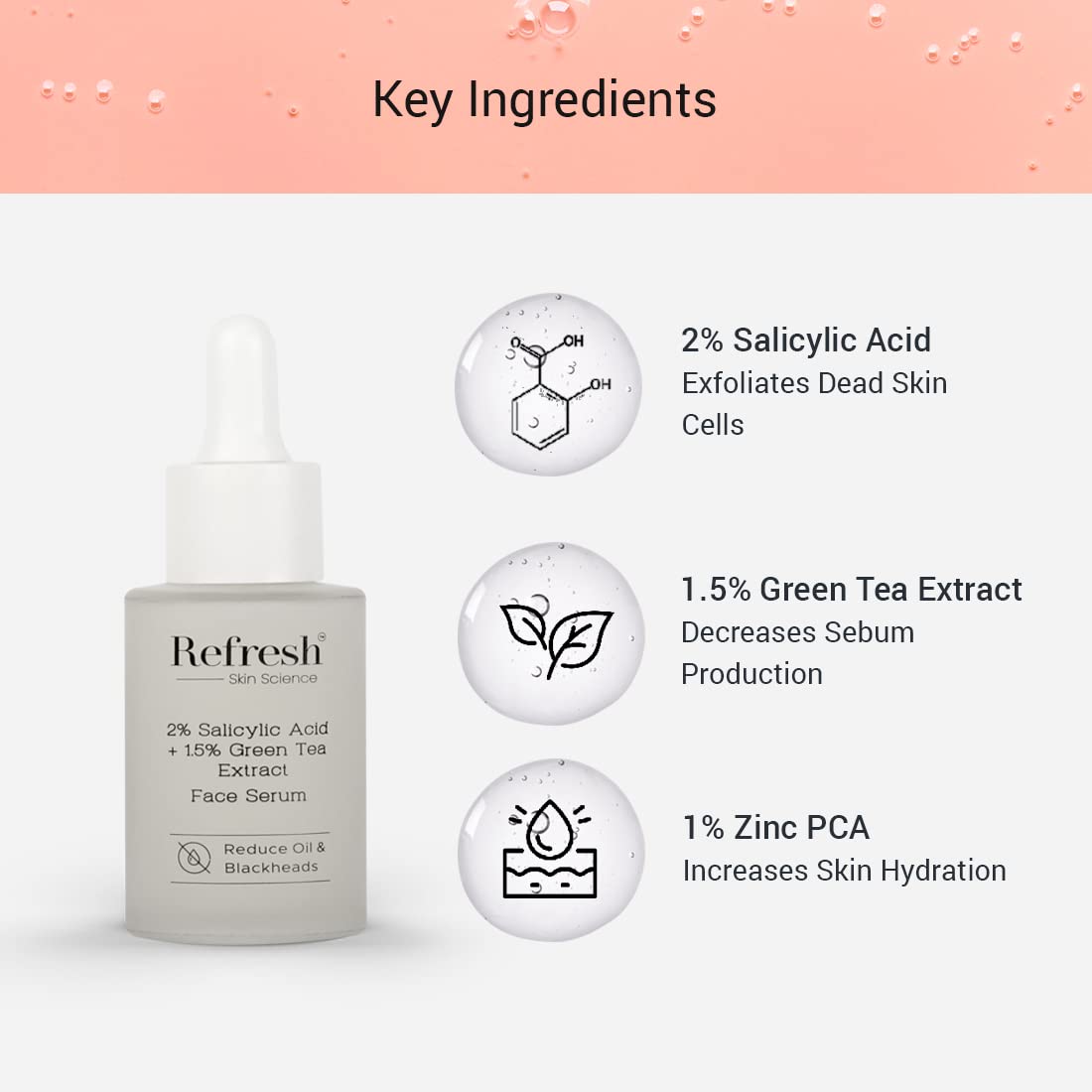 The gentlest exfoliant to get rid of active acne and blackheads! Formulated with a combination of 2% Salicylic acid serum and 1.5% Green tea extract perfect for oily skin to deep cleanse extra oil from the pores.