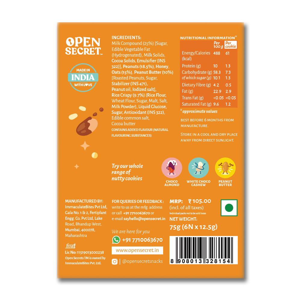 With Peanuts as the main ingredient, our Peanut Butter Nutty Cookies are made with 40-50% nuts & oats. Packed with protein, full of fibre and no added maida make Open Secret Cookies a perfect tiffin snack. Our cookies are healthy and tasty. Once you start, you will never stop!