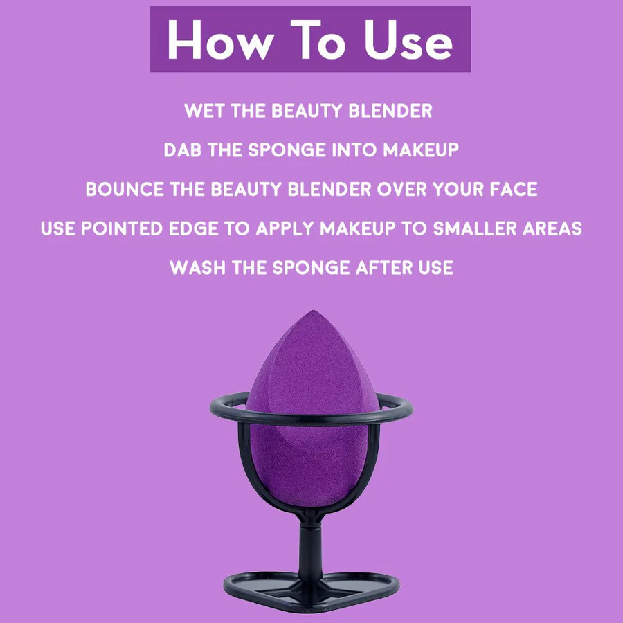 Wet the beauty blender Dab the sponge into makeup Bounce the beauty blender over your face Use pointed edge to apply makeup to smaller areas Wash the sponge after use