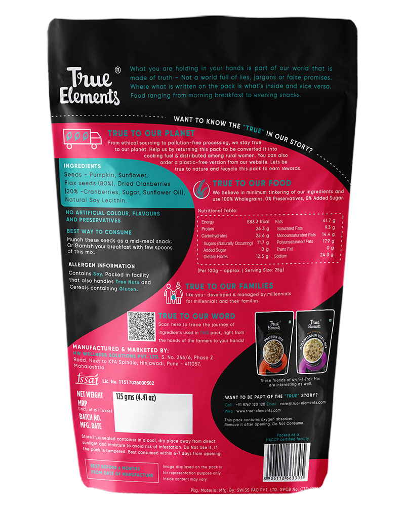 True Elements snacks roasted sunflower pumpkin flax seeds has come up with a new and unique combination consisting of cranberries to satiate the berry cravings and improve the overall health of a body. Loaded with abundant nutrients and minerals, this new combination can now become a delicious snack because of its presence of cranberries.