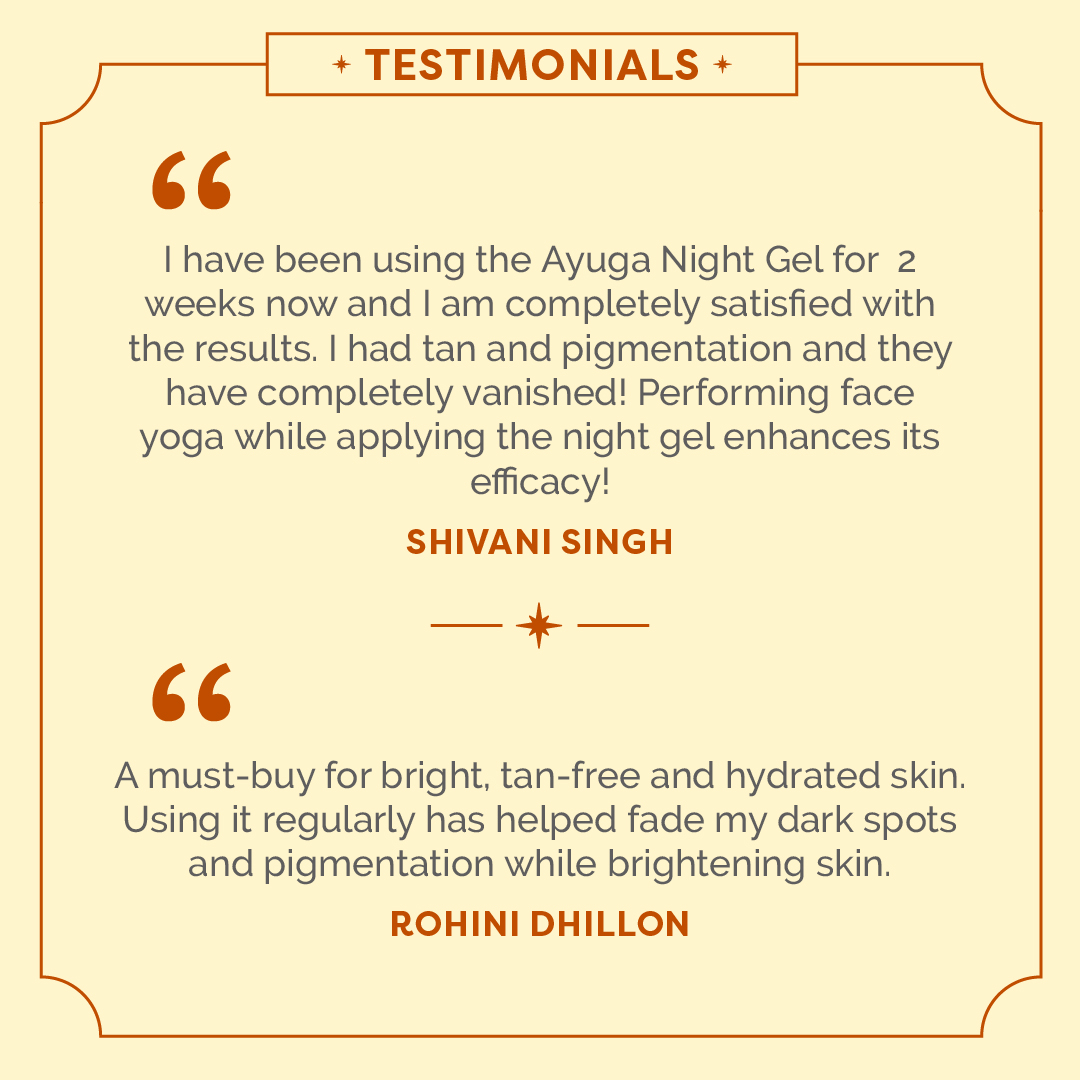 Unlock radiance with the power of Ayurveda. Introducing 5% Chandanam Skin Brightening Night Gel, an all-night treatment that deeply hydrates and brightens your skin. It is enriched with 5% Chandanam Oil containing Sandalwood, Turmeric, and 26 precious herbs sourced from dense Indian forest and magnificent Himalayas. The Night Gel actively works on dark spots and pigmentation while you sleep so you wake up to a flawless, glowing skin.. Suitable for all skin types, the 5% Chandanam Skin Brightening Night Gel has a lightweight, gel-based and non-sticky texture that gets easily absorbed into your skin, making it soft and plump.