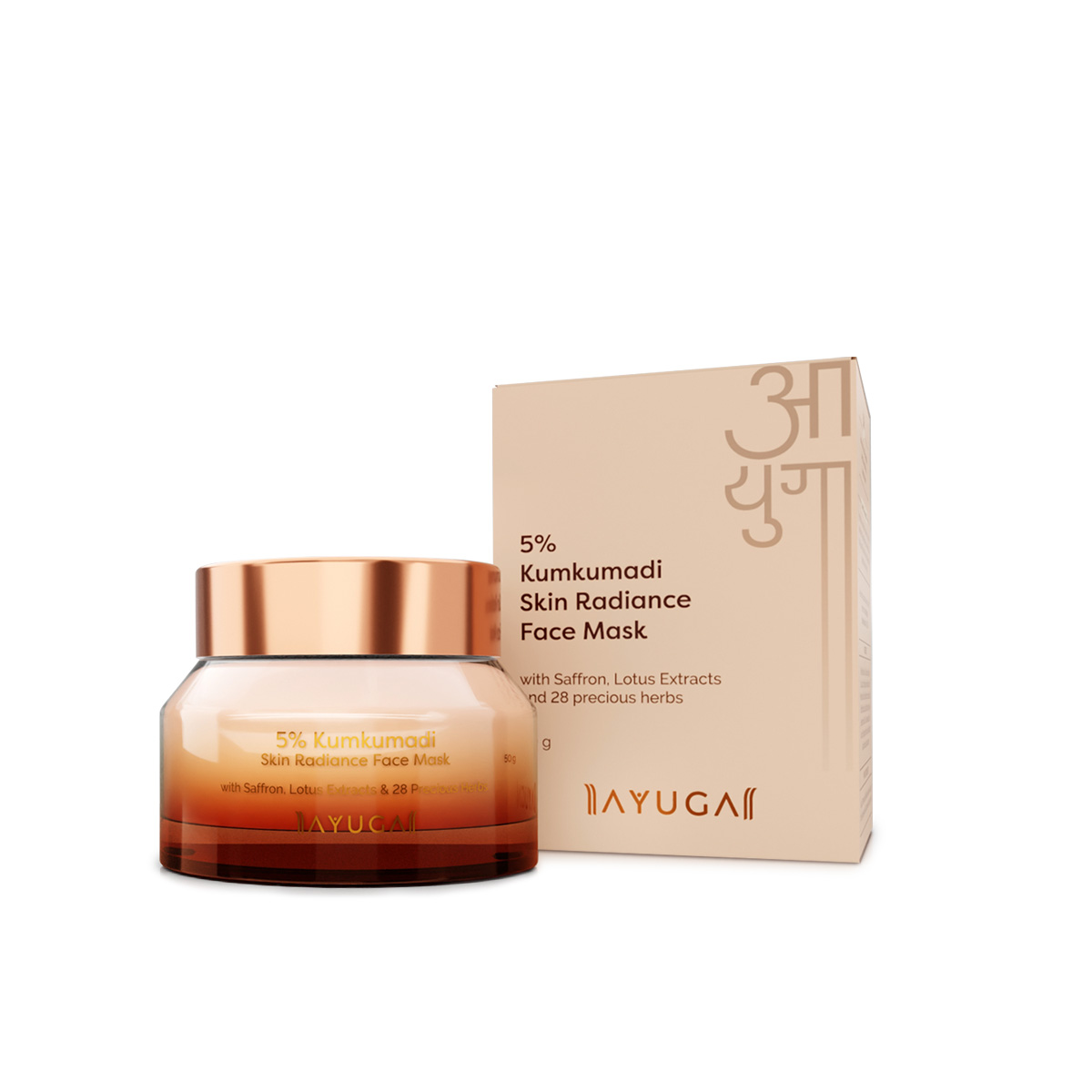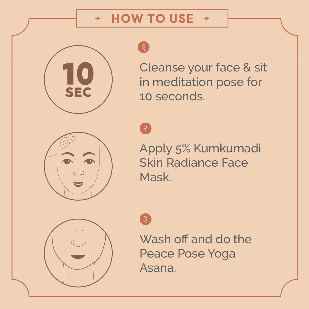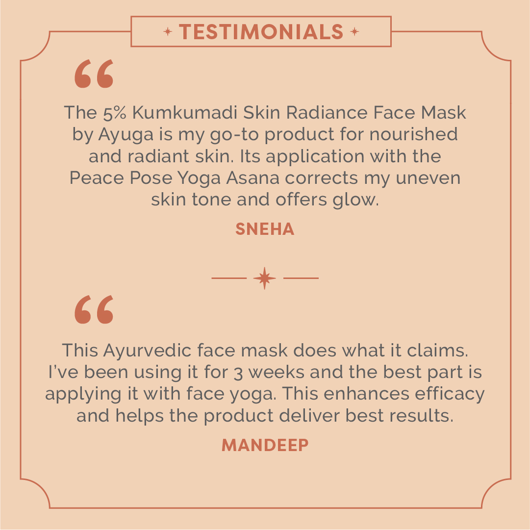 Unlock the power of tradition. Achieve radiant skin with an ayurvedic formulation fused with the rituals of face yoga. Introducing 5% kumkumadi skin radiance face mask, a nourishing and retexturing face mask that makes skin soft, plump, and naturally radiant. Derived from authentic ayurveda and suitable for all skin types, the 5% kumkumadi skin radiance face mask is a formulation enriched with 5% kumkumadi oil containing a blend of usda certified organic ingredients like saffron, lotus extracts, and 28 precious herbs. It helps reduce dark spots and pigmentation, corrects uneven skin tone, soothes skin, and unveils a natural radiance. This 100% natural formula works better when you do too! Use ayuga 5% kumkumadi skin radiance face mask with the peace pose yoga asana and get ready to unlock brighter, radiant, and younger-looking skin.