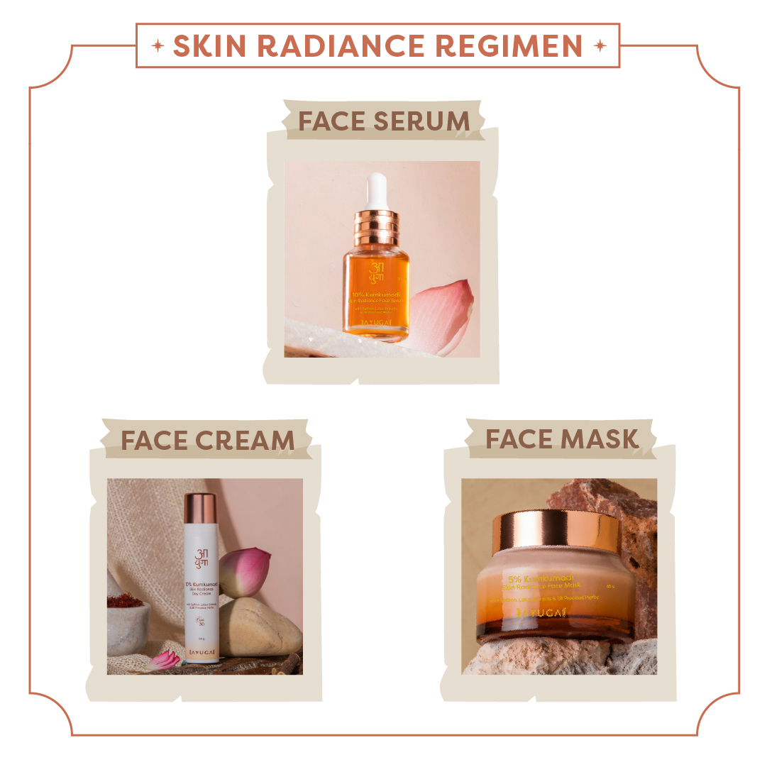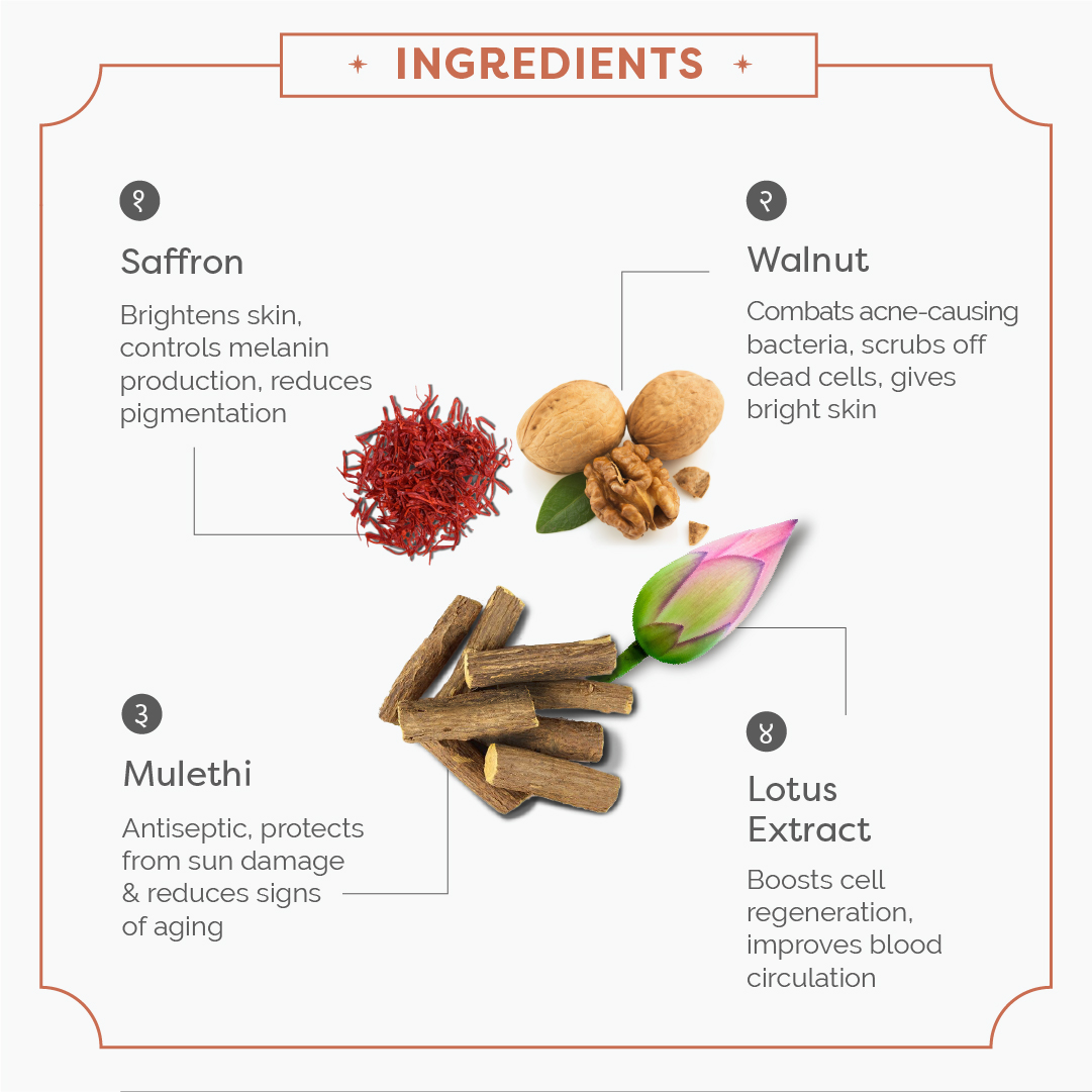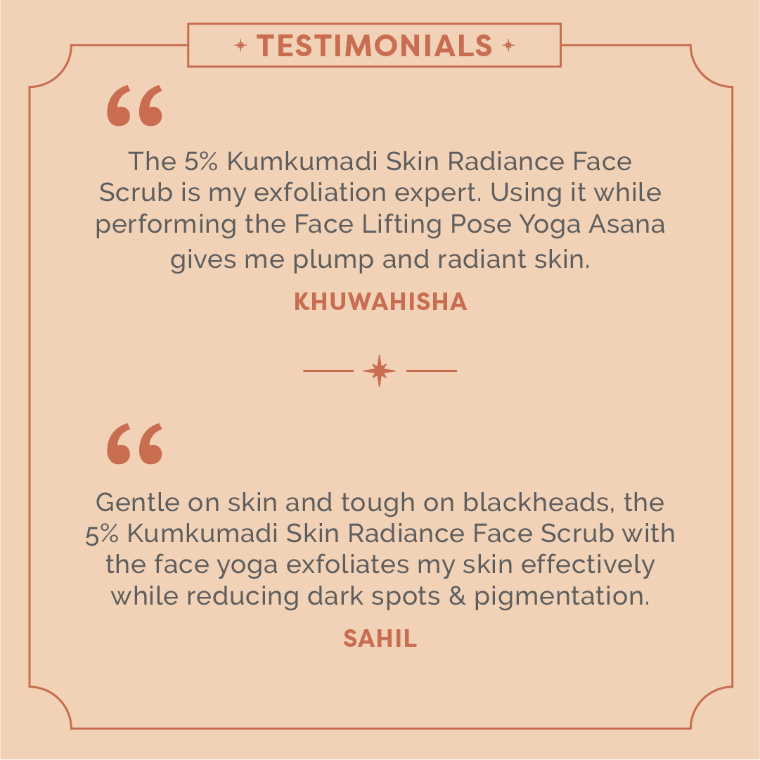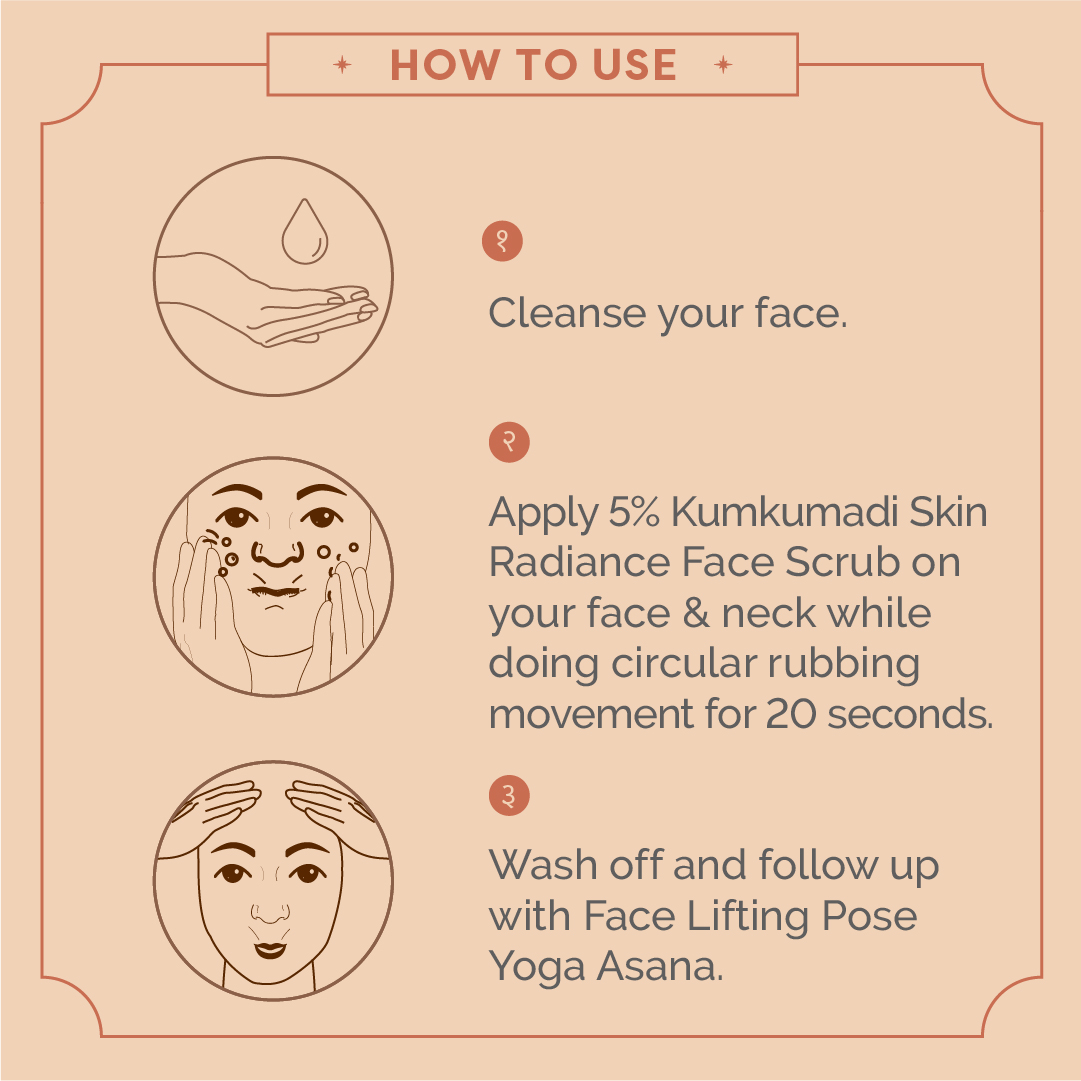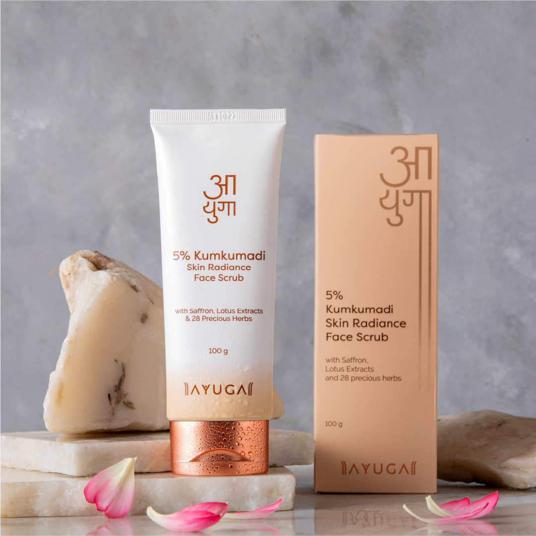 Take the everyday challenge of achieving radiant skin. Unlock the power of naturally derived ingredients with an ayurvedic formulation fused with the rituals of facial yoga. Introducing 5% kumkumadi skin radiance face scrub, a natural face exfoliator that deeply cleanses resulting in soft, supple, radiant, and younger-looking skin. Derived from authentic ayurveda and suitable for all skin types, the 5% kumkumadi skin radiance face scrub is a formulation enriched with 5% kumkumadi oil containing a blend of usda certified organic ingredients like saffron, lotus extracts and 28 precious herbs. Suitable for all skin types, this face scrub reduces dark spots and pigmentation too. This 100% natural formula works better when you do too! Use ayuga 5% kumkumadi skin radiance face scrub with the face lifting pose yoga asana to reveal skin thats soft, supple, and reflects radiance.