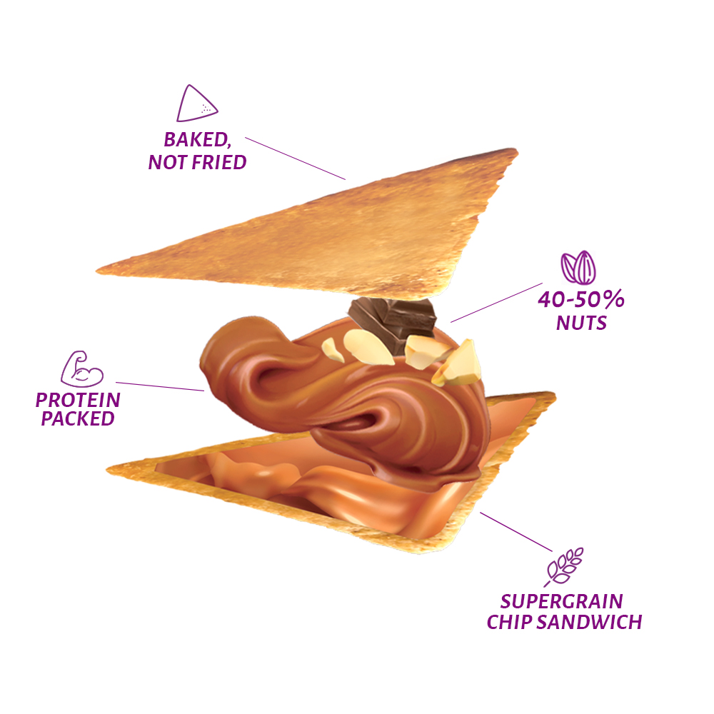Unjunking chips with Creamy Choco Almond Butter sandwiched between Crunchy Baked Super-grain Wafers, perfect for on the go or at home snacking. These chips dont lack for confidence. Chocolate and nut butter, will keep you snacking and chatting all night long!