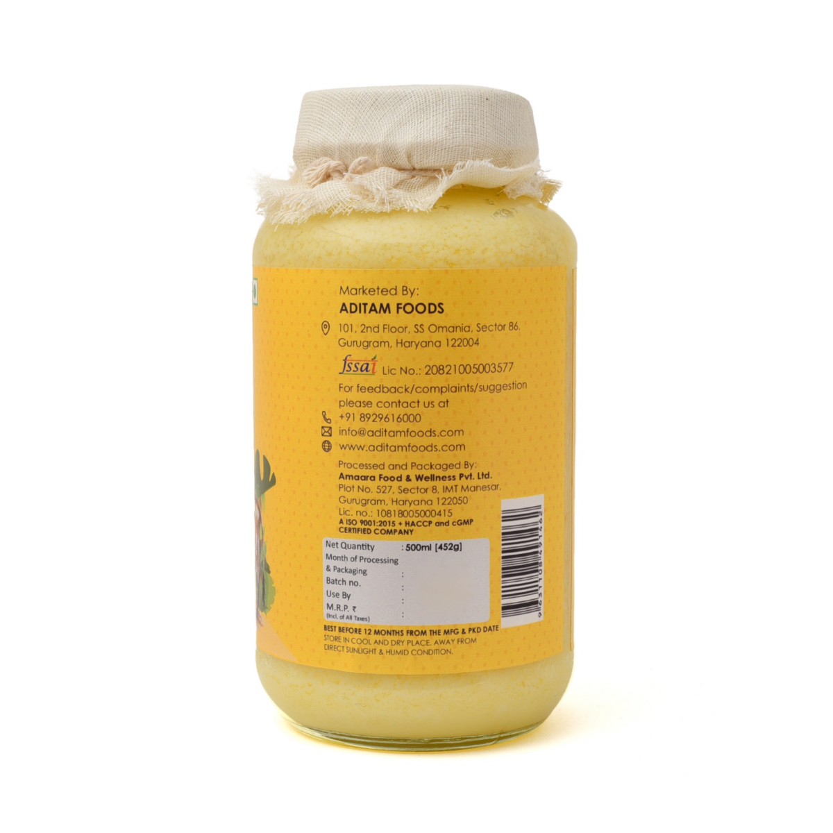 Aditams A2 Ghee is high in nutritive fatty acids, calcium, iron, sodium and fat-soluble vitamins A, D and E, making it an excellent fat source for an Indian vegetarian diet. Aditam A2 Ghee is handmade with utmost care and hygiene. Prepare by simmering butter, which is churned from cultured curd (traditionally made Dahi), skimming all milk solids from the surface, then pouring and retaining the clear liquid Vedic ghee.