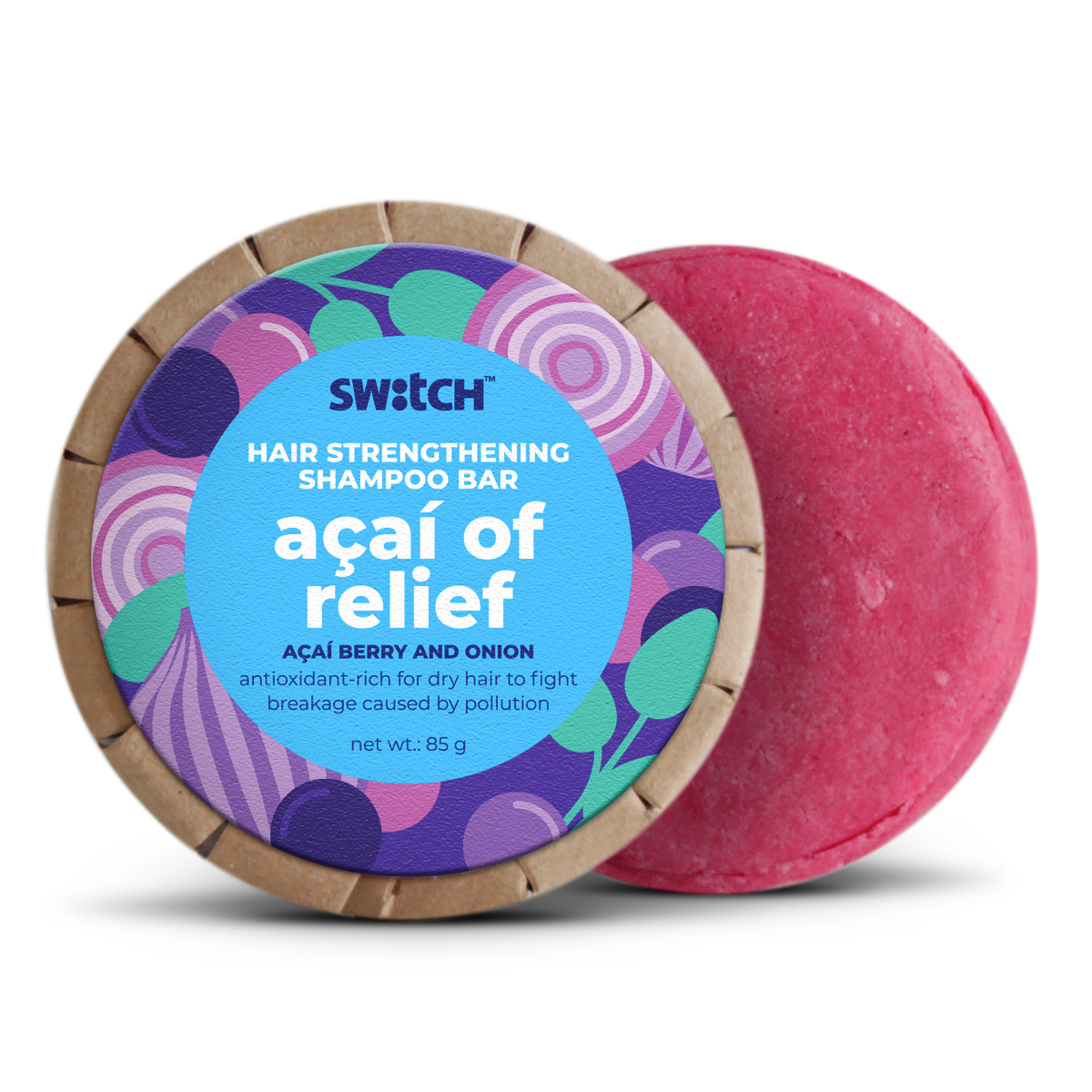 Shampoo Bar for Hair Strengthening and DetanglingNever miss the flight to Rad Hair Day town. Sit back and relax as Acai of Relief gently cleanses, strengthens, improves overall scalp health while reducing breakage caused due to environmental stressors.