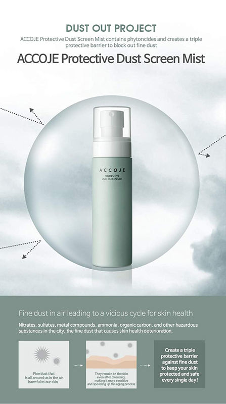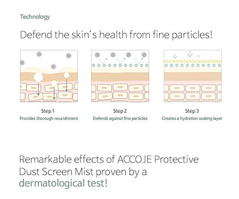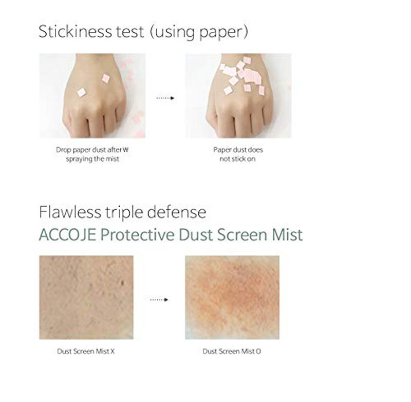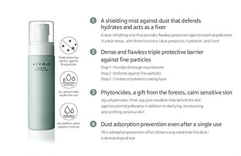 Benefits of Accoje Protective Dust Screen Mist: A shielding mist against dust that defends, hydrates & acts as a fixer.Dense & flawless triple protective barrier against fine particles.