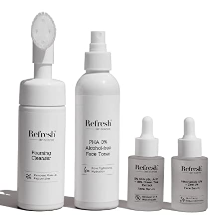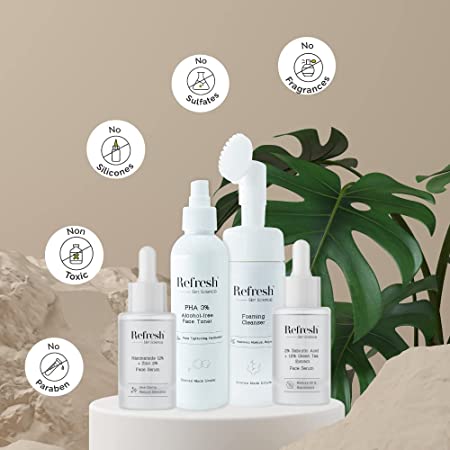 Worried of acne breakouts? Refresh Skin Science is proud of offering high quality products that heal acne related problems and provide lasting benefits. Our skin care products kit comes with 4 products as 2% Salicylic Acid Serum, Niacinamide Serum, Cleanser and Toner for a healthy skin!