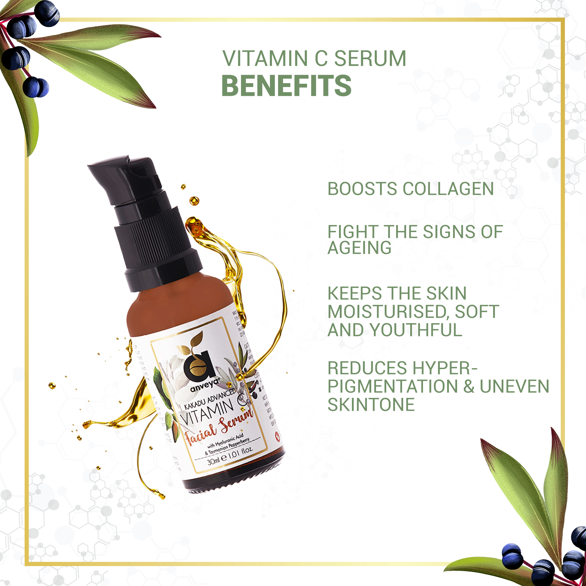1. Anti-ageing & wrinkles: vitamin c serum fights premature aging of the skin, protects against sun damage, and increases collagen production.