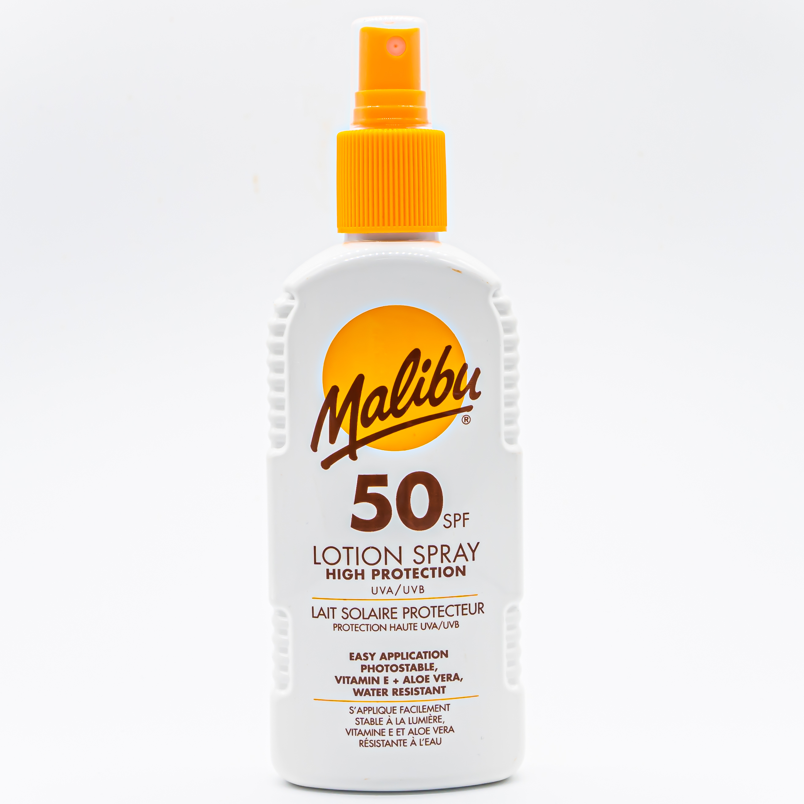 Malibu Sun Lotion SPF 50 Spray provides very high protection from harmful UVA and UVB rays from the sun. Its vitamin-enriched and water-resistant formula is easy to apply. Malibu protects your skin all year round. Use it every day, any weather, indoors or outdoors to protect your skin from the sun.
