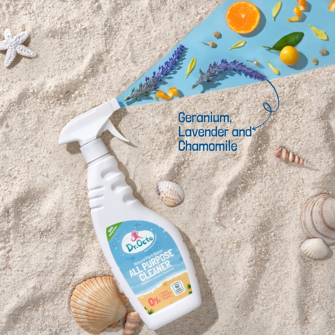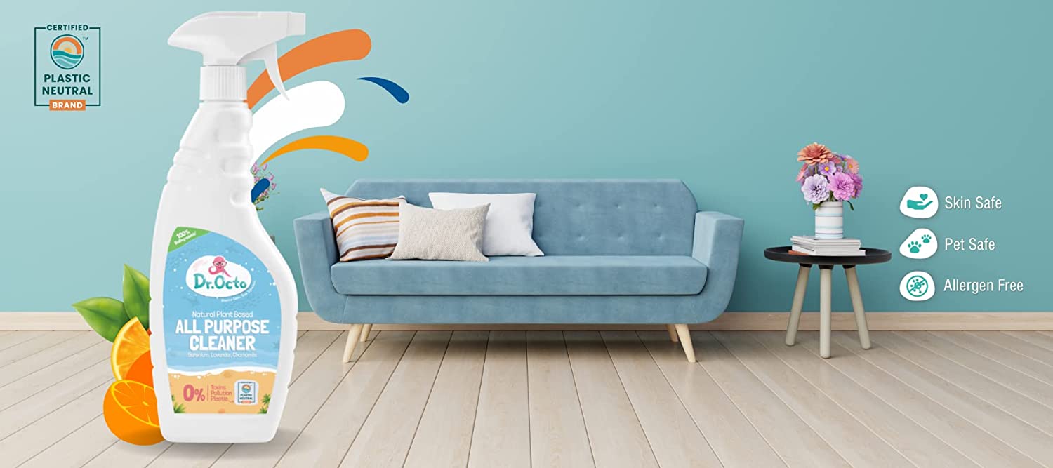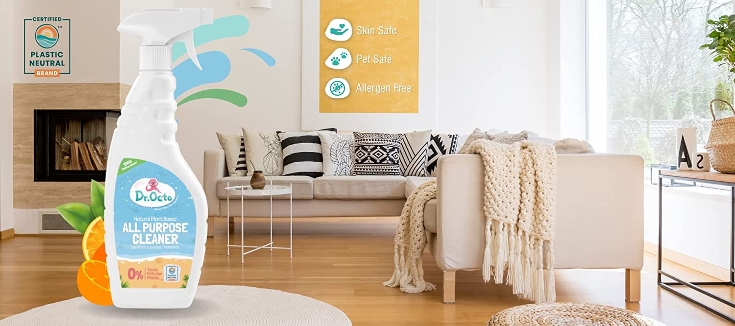 Dr.Octo All Purpose Cleaner is powered by Citrus. Real, Natural Citrus!! We take Orange and Lemon peels and extract a natural solvent called 'Limonene'. It is limonene that gives citrus it's unique zingy fragrance. But it does more that that. Citrus oils are very good at breaking down oils and fats. This makes our All purpose spray, an ideal partner to clean high contact surfaces like Kitchen counters, Dining Table, Counter tops and door knobs. Our formulation is Skin Safe, Pet Safe and Free from harsh chemicals unlike regular cleaning sprays! It smells amazing with natural citrus notes that are clean and refreshing! Just one spray and wipe! You will see the difference! We are a Plastic Neutral Brand! We recycle as much as we sell.