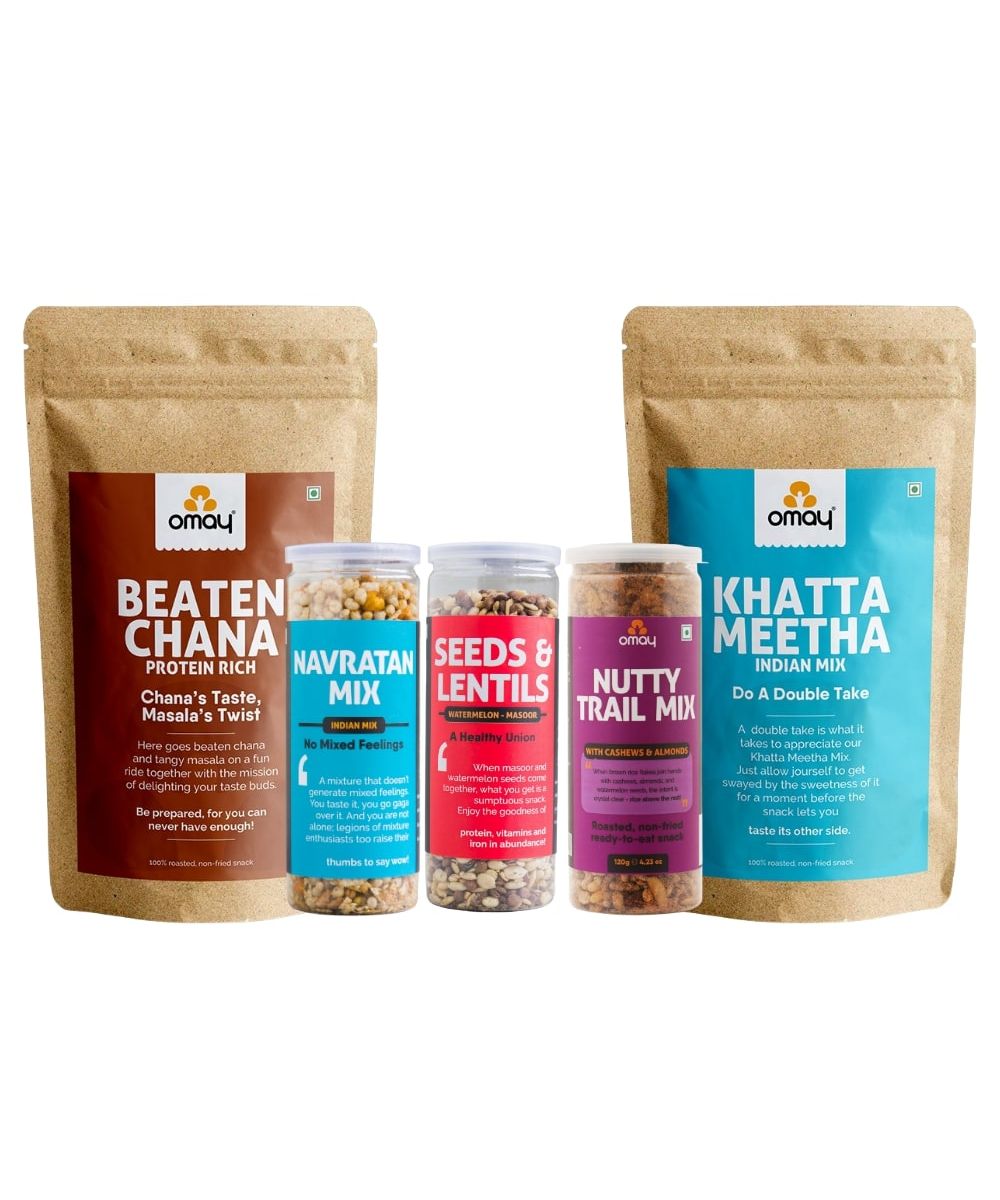 Missing chat-patta flavours in life? Here's our essentials pack that just does the right justice to your tastebuds. Includes: Beaten Chana (400 gm Pouch) x 1; Khatta Meetha Mix (400 gm Pouch) x 1; Seeds & Lentils (160 gm Jar) x 1; Nutty Mix (120 gm Jar) x 1; Navratan Mix (100 gm Jar) x 1.