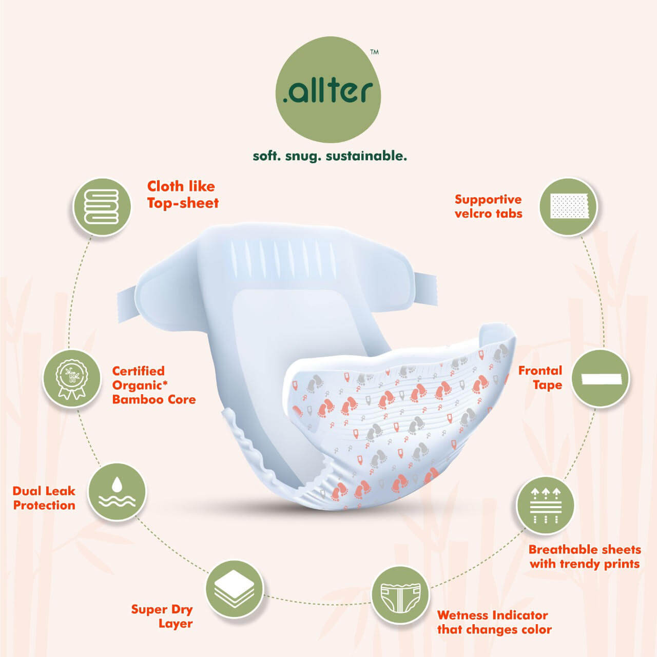 Soft and snug, like a mothers hug. Allter baby diapers are a perfect combination of the goodness of natural fiber with the ease of disposable diapers. Allter diapers are made up of Certified Organic Bamboo, which makes them gentle not only for your baby, but for the environment too.
