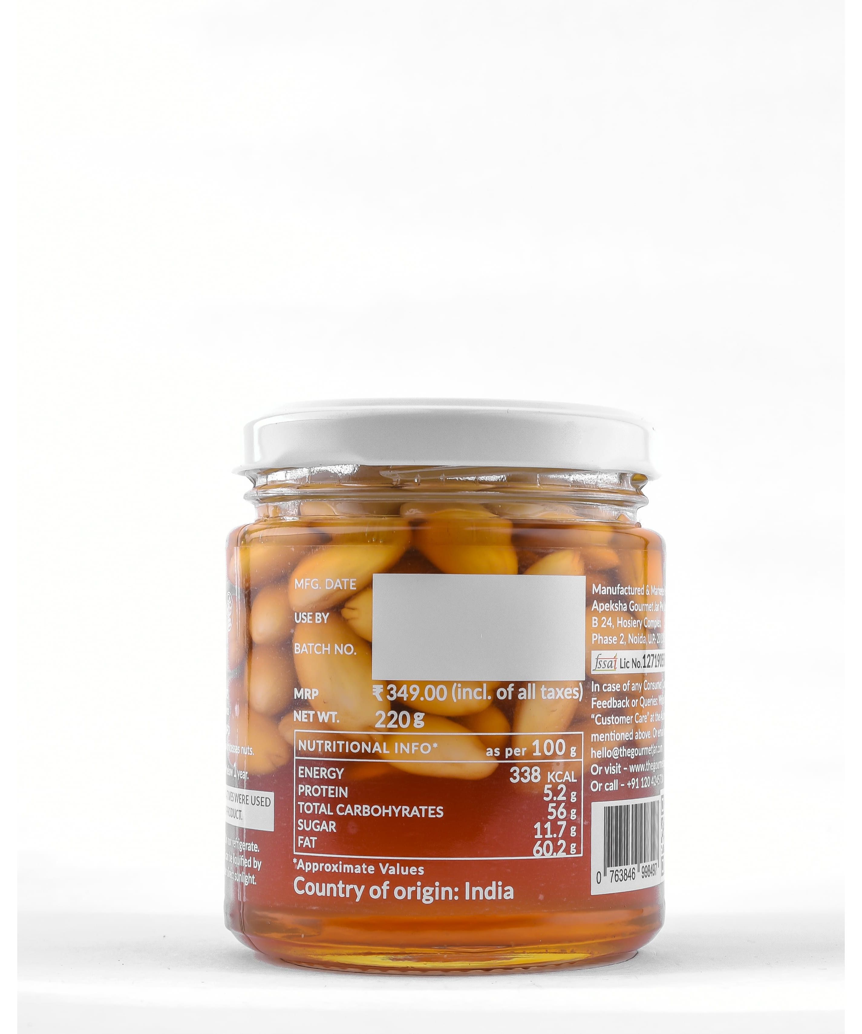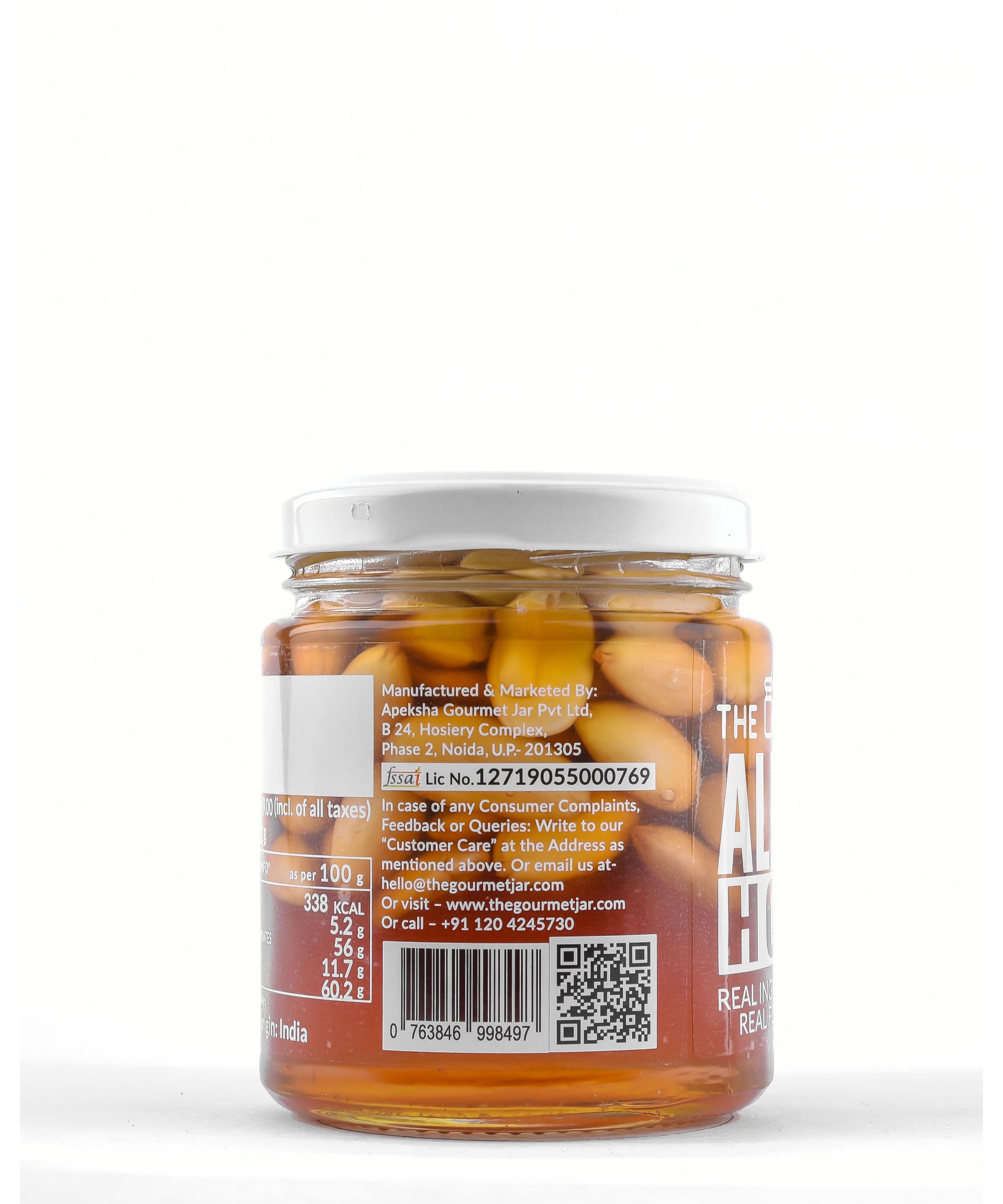 Indulge in the harmonious fusion of flavors with our Almond Honey blend. Carefully crafted, blanched almonds, known for their delicate texture, are lovingly steeped in pure, organic honey sourced from the serene farms of North India. This exquisite combination gives rise to a truly wholesome snack, best savored straight from the jar with a spoon, or used to elevate your favorite treats like yogurt or ice-cream. Every spoonful encapsulates the natural goodness of almonds and the rich sweetness of honey, offering both taste and nourishment in one irresistible jar.