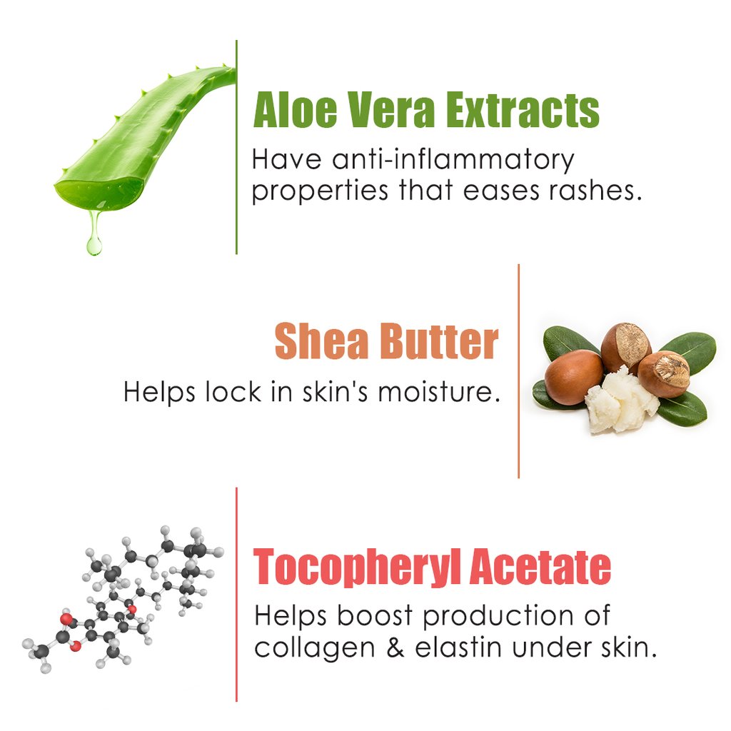 Aloe Vera Extract, Argan & Almond Oils, Shea & Cocoa Butters, Hyaluronic Acid, D Panthenol (Pro-Vitamin B5) & Tocopheryl Acetate (Vitamin E)