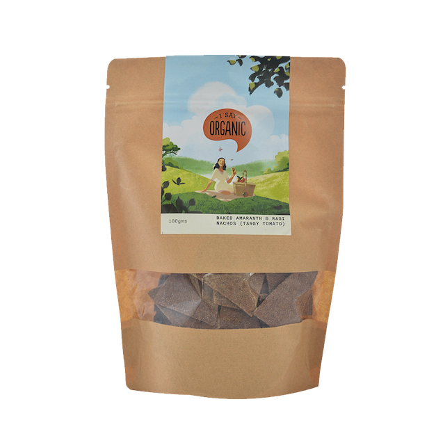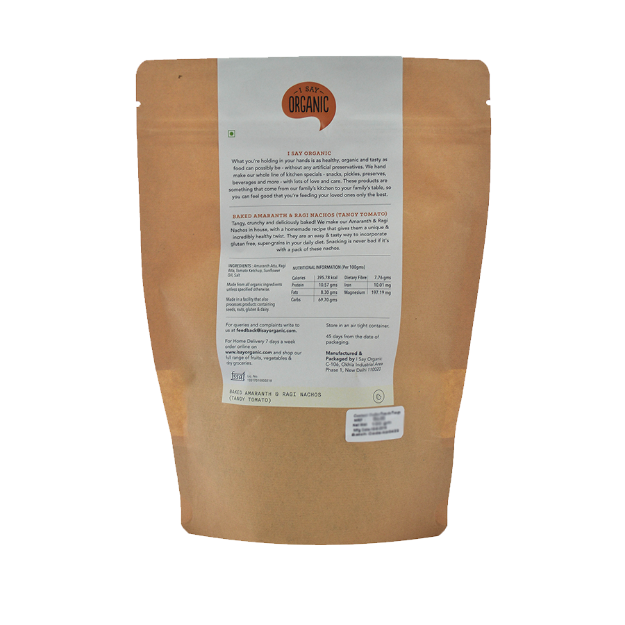 Tangy, crunchy and deliciously baked! We make our Amaranth & Ragi Nachos in house, with a homemade recipe that gives them a unique & incredibly healthy twist. They are an easy & tasty way to incoroporate gluten free, super-grains in your daily diet. Snacking is never bad if it's with a pack of these nachos :) Pair it with some delicious homemade hummus, guacamole or our Tomato Pickles!
