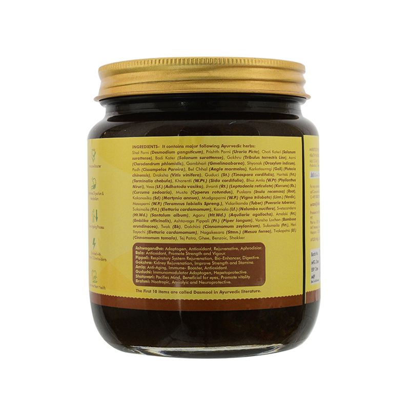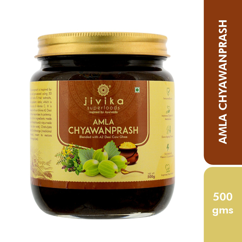 Jivika's superfood Chyawanprash is inspired by Ayurvedic formulation and processed using 50 medicinal nutrient-rich herbs and their extracts, including the prime ingredient, Amla, which is the worlds richest source of vitamin C. It is again skilfully processed with our divine A2 Desi Cow Ghee, which further maximises its potency. Our Chyawanprash is rich in ingredients made of mainly three class of herbs found in Ayurveda called Dashmula Class (ten roots), Chaturjata (four aromatic plants) and Ashtavarga (medicinal herbs from Himalayas), meant to restore drained reserves of energy (ojas).