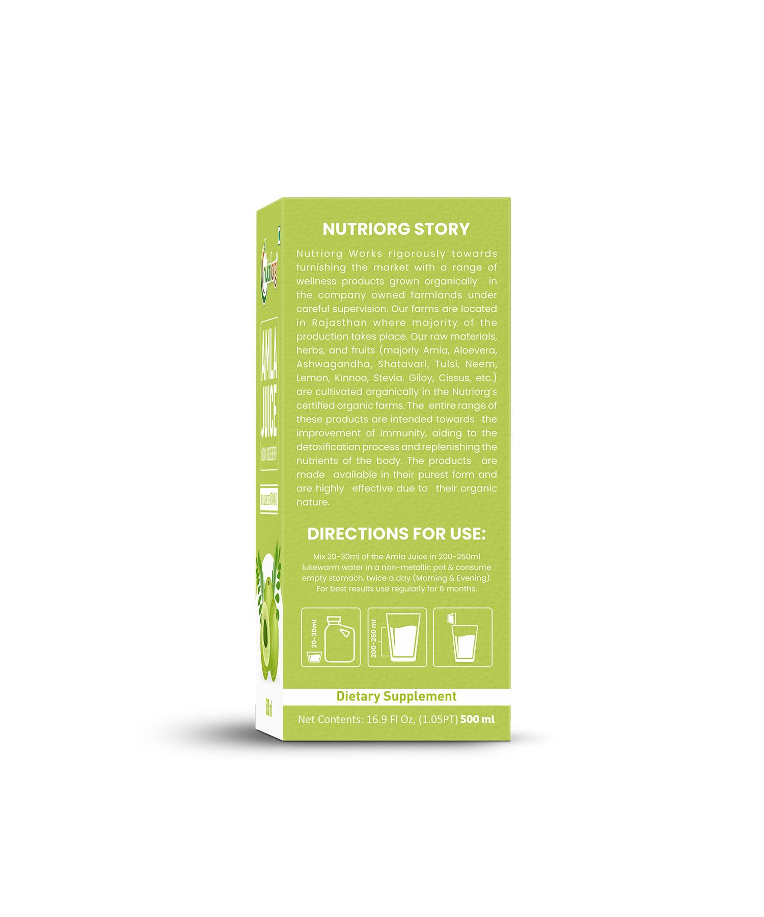 Nutriorg Amla Juice is made from Organic Amla which is cultivated in company own certified organic farmland situated in Rajasthan. Nutriorg Amla Juice is 100% pure and unadultered. Amla is the richest source of vitamin-C. It enhances immunity, good for eyes,skin,hair. It also helps in improving the efficacy of others vitamins in the body. Amla is also known to improve vitality. Amla is considered the most powerful herb to manage overall health and well being. According to the ancient science of Ayurveda, regular consumption of amla balances all three doshas, namely, Vata, Pitta and Kapha. Its cooling properties balance both Vata and Pitta whereas its drying properties have a balancing effect of Kaphadosha. Amla is used for promoting longevity, improving digestion, health, stimulating the hair growth, enhancing concentration and memory. Amla is a rich source of Vitamin C, it is considered to contain 20 times more Vitamin C than oranges. It is also rich in proteins and fibers. It contains minerals such as Iron, Calcium and Phosphorous besides Vitamin A and C. It is also one of the strongest immunity boosters for mankind which means that regular intake of amla will help build immunity. It is also ideal for lessoning skin problems like acne, wrinkles and other skin problems.