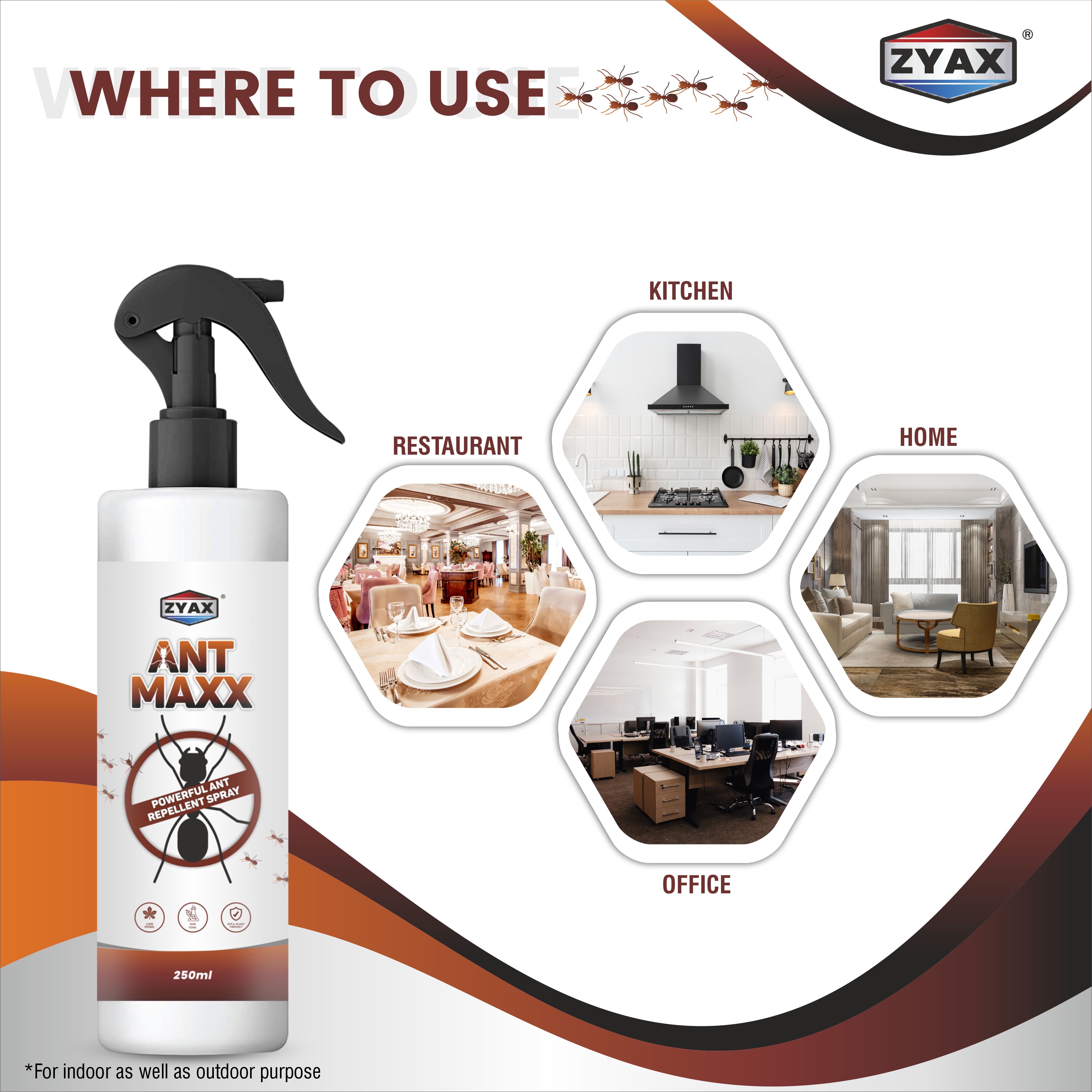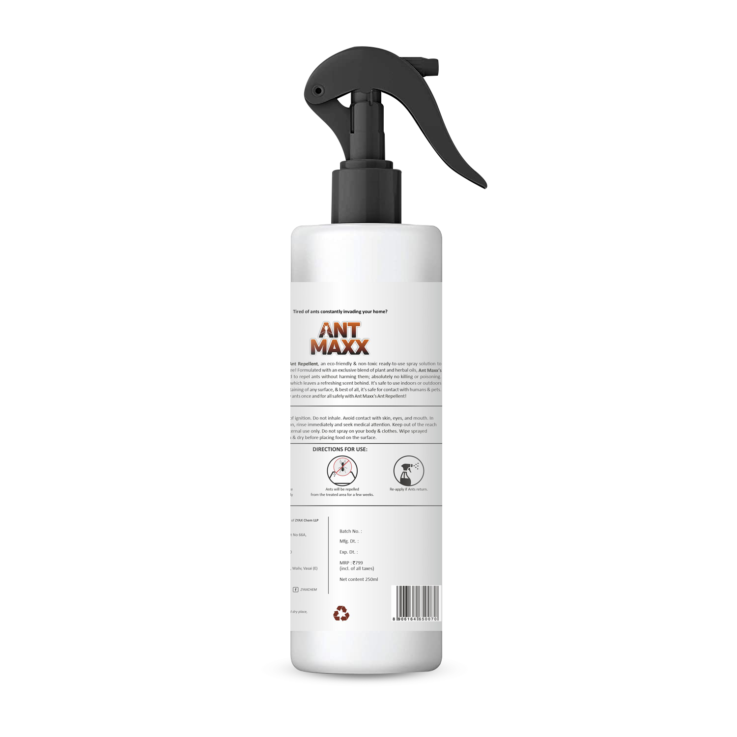 Zyax Ant Maxx Ant Repellent Spray is a powerful solution specifically formulated to combat ant infestations. This handy 100 ml spray bottle provides a convenient and effective way to control ants in and around your home. Designed with efficiency in mind, Zyax Ant Maxx features a potent formula that repels ants and prevents them from entering your living spaces. The spray is specially created to target common ant species, such as sugar ants, carpenter ants, and pavement ants. It works by emitting a scent that ants find unpleasant, deterring them from establishing trails or nests in treated areas. The spray can be applied indoors, such as along baseboards, near windows and doors, and in kitchen areas, as well as outdoors on patios, decks, and other ant-prone areas. Its compact size makes it easy to carry and store, allowing you to address ant problems whenever and wherever they arise. It is important to note that Zyax Ant Maxx is for external use only and should be kept out of reach of children and pets. Say goodbye to unwanted ant invasions with Zyax Ant Maxx Ant Repellent Spray. Its targeted formulation and convenient packaging make it a reliable choice for ant control, allowing you to maintain a clean and ant-free environment in your home.