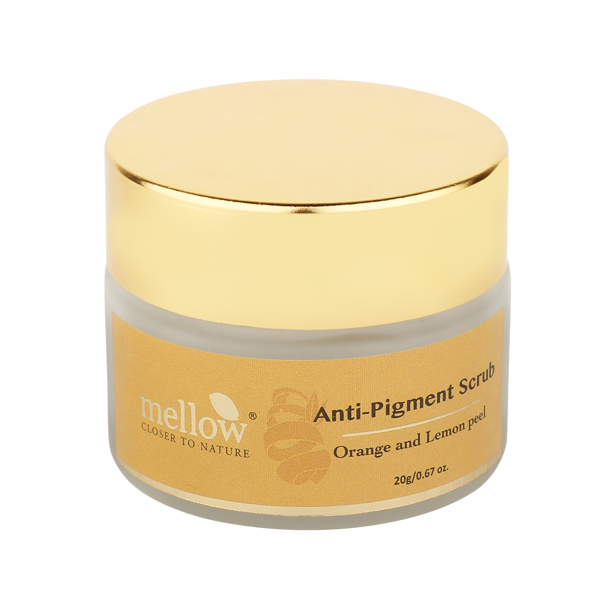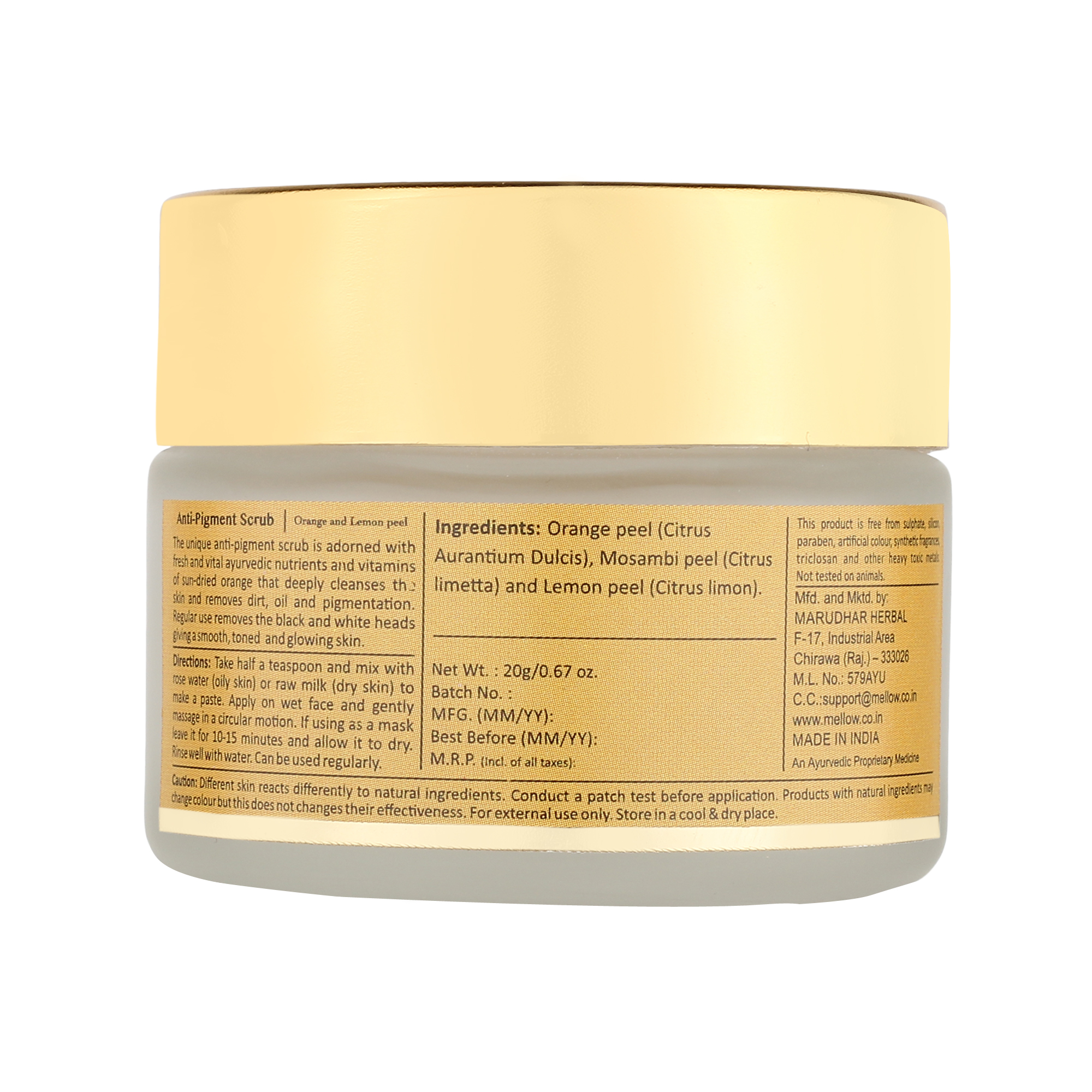 Mellow"s Anti Pigment Face Scrub relieves your skin from pigmentation. It is an ideal beauty scrub that gives a natural glow to the skin. The magical formula for skin is inspired by Ayurveda. It has authentic natural herbs and extracts that complete it as a facial scrub for normal skin. Anti Pigment Face Scrub is to leave you stunned with soft clean skin. The ayurvedic constitution of herbs naturally exfoliates and cleanses your pores. This Vitamin C rich scrub leaves you with a clear complexion.
