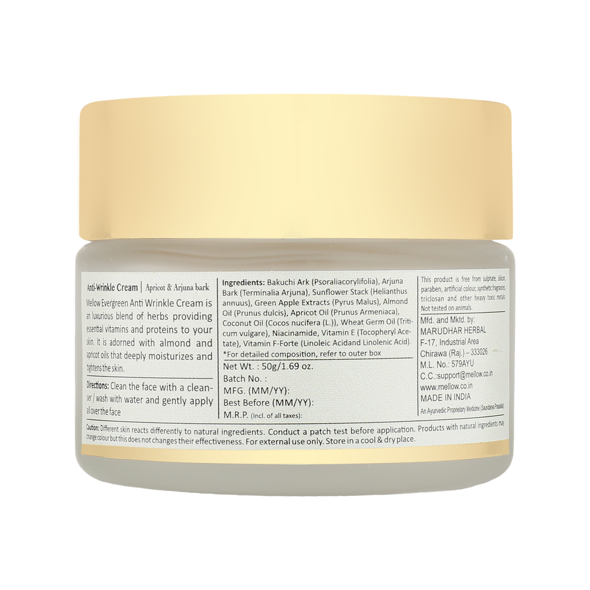 Mellows anti-wrinkle cream nourishes the skin deeply with essential nutrients. The cream is loaded with a richness of natural herbs, almond and apricot oil. It is a powerful Ayurvedic formulation that gives you visible results and reinforced skin cells. This anti-wrinkle cream leaves you with tightened and glowing skin. Mellows anti-wrinkle cream is an effective blend of natural herbs to treat wrinkles and fine lines. It helps prevent early signs of aging and keeps your skin hydrated