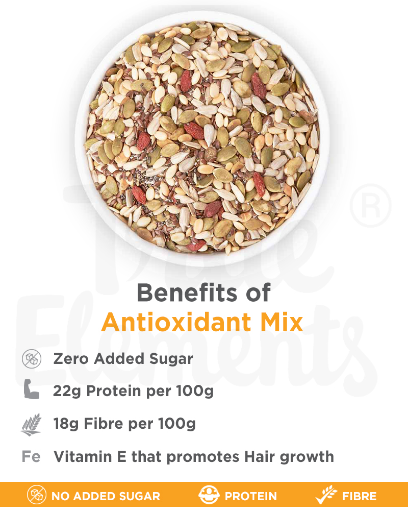 True Elements Antioxidant Seeds mix is an all-in-one crunchy delight for sudden snack cravings. Loaded with many health benefits and nutrients, these roasted seeds are a combination of seeds such as sunflower seeds, pumpkin seeds, flax seeds, watermelon seeds, chia seeds and goji berries. They not only increase the nutrient quantity but also makes it a delicious snack. Along with the addition of watermelon and chia seeds, Antioxidant Seeds provide additional health benefits, thus contributing to a longer and healthier life.