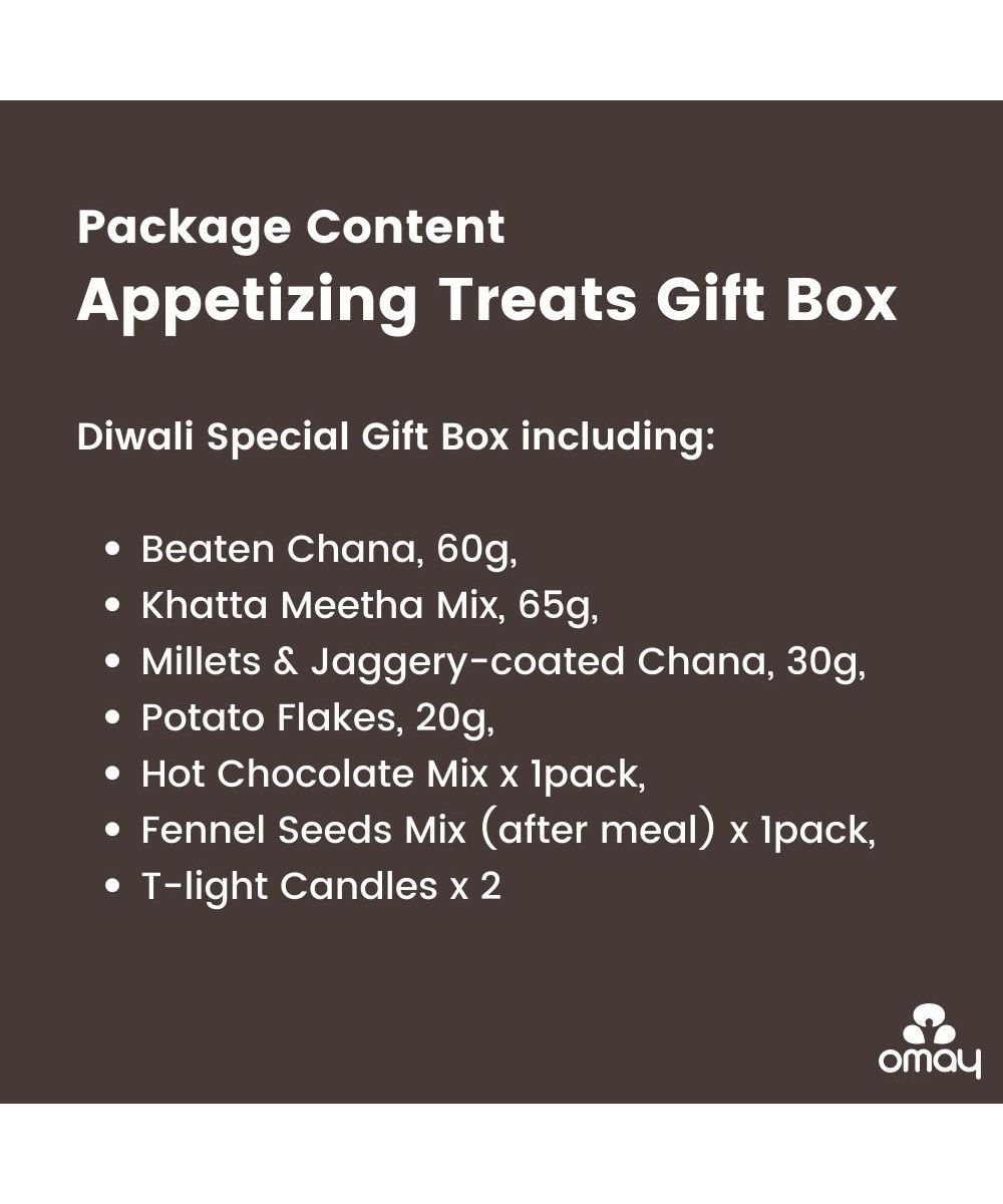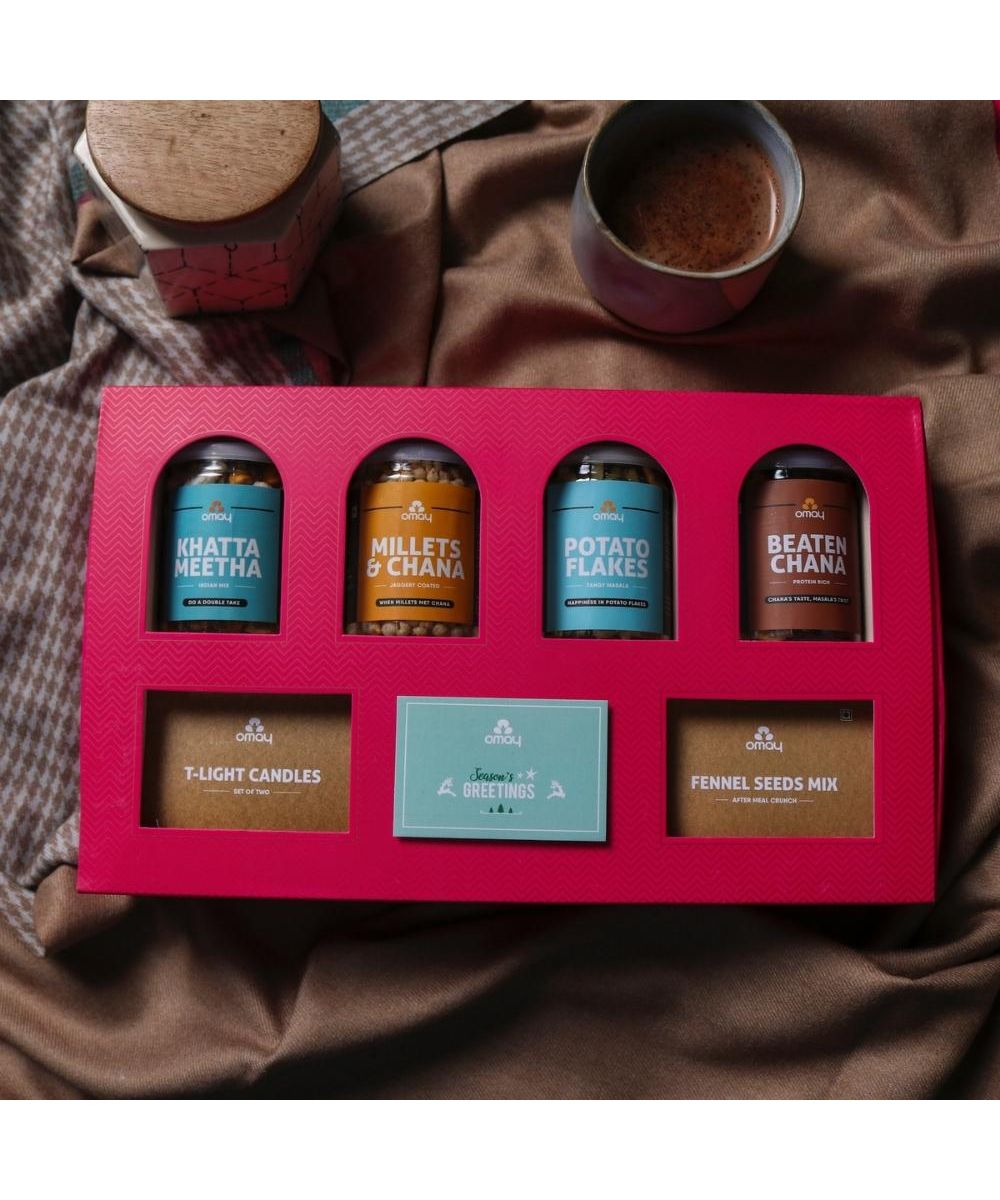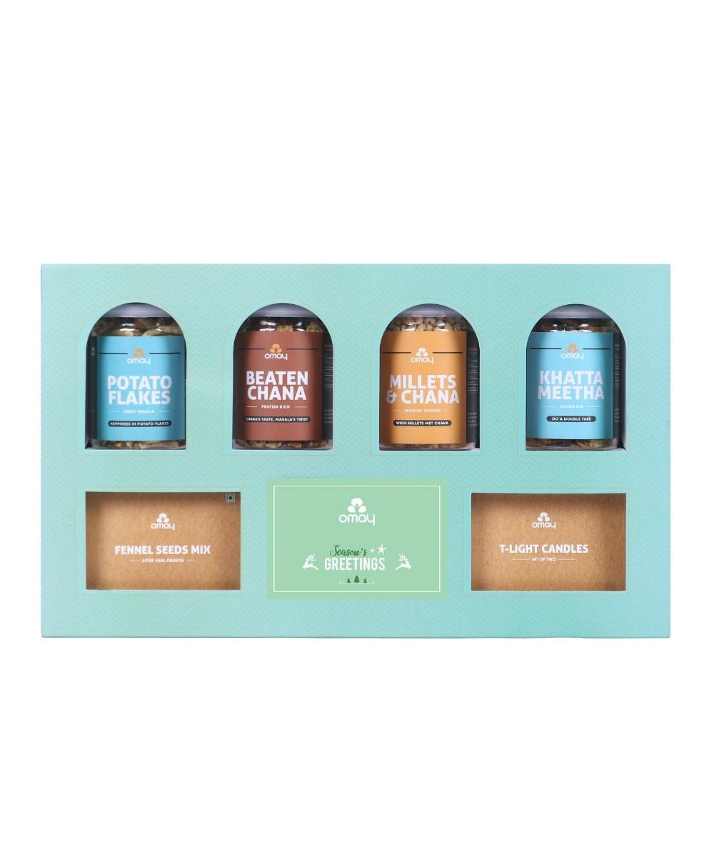 A Gift Box that has it all! This vibrant coloured box comes with four of Omay Foods bestselling Roasted snacks, a pack of Fennel Seeds Mix (mouth freshener) and a mighty mix of drinking Chocolate. That's not all, it also has a pack of T-light candles - to light up your celebrations, just the perfect way :)Inclusions: Beaten Chana, 60g, Khatta Meetha, 65g, Millets & Jaggery-coasted Chana, 30g, Potato Flakes, 20g, Drinking Chocolate Mix x 1, T-light Candles x 2, Fennel Seeds Mix x 1