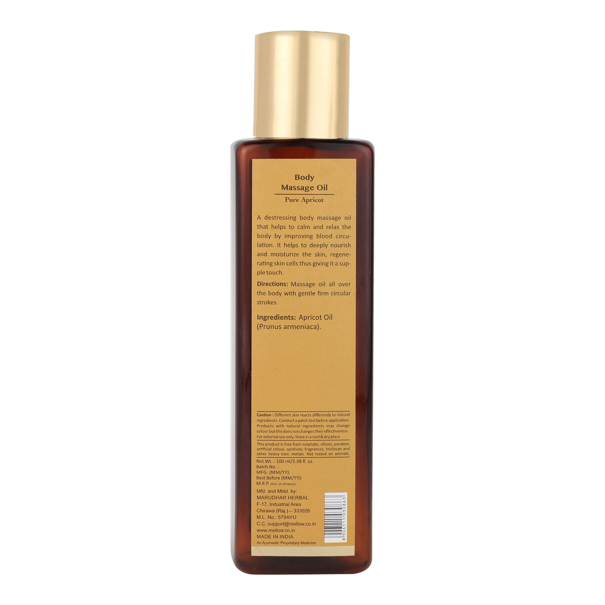Mellow"s Apricot Massage oil renders a smooth skin that glows and gives a radiant appeal. The oil contains extracts of almond that deeply nourish and moisturizes the skin. Apricot oil is rich in Vitamin C and E. It can help to improve skin tone and lower the appearance of face wrinkles, fine lines, and blemishes. Apricot Body Massage Oil is a treat to your body. It stimulates the energy that flows in to relax your tissues. The massage oil nourishes your body deeply and helps the regeneration of the new skin cells.