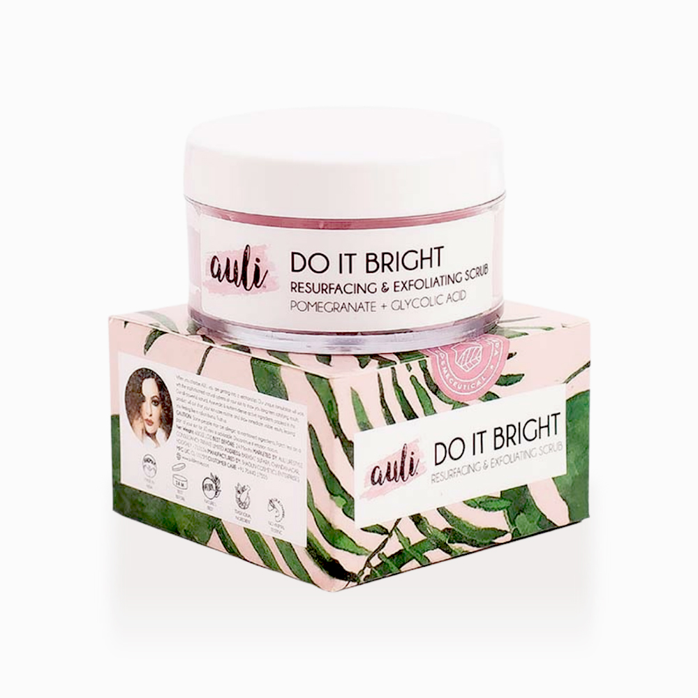 Do It Bright by Auli, is an AHA 5% exfoliating face scrub made for all skin types. This Pomegranate extract rich exfoliating scrub infused with a combination of AHA: Glycolic Acid (5%) and Rice Water, gives the skin a healthy glow. The lightweight, milky texture gently buffs away dead skin cells, purifies pores and removes impurities. It also makes the perfect canvas for seamless makeup and skincare product application.
