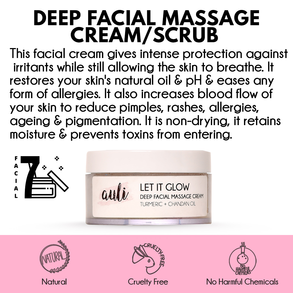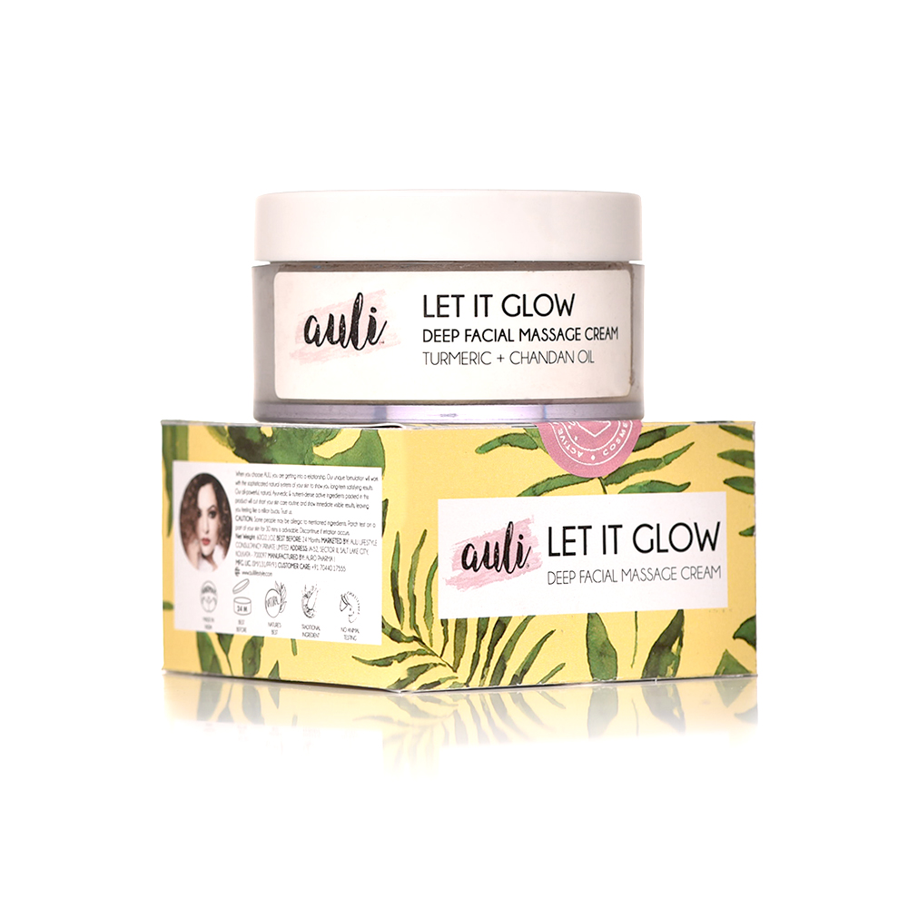 | Let it Glow by Auli, is a facial cream that gives intense protection against irritants while still allowing the skin to breathe. It restores your skin's natural oil and pH and eases any form of allergies. It also increases blood flow of your skin to reduce pimples, rashes, allergies, ageing and pigmentation. It is non-drying, it retains moisture and prevents toxins from entering. Healthy glowing skin is in, with Auli. |