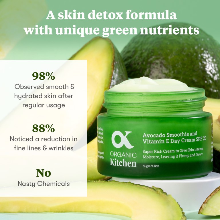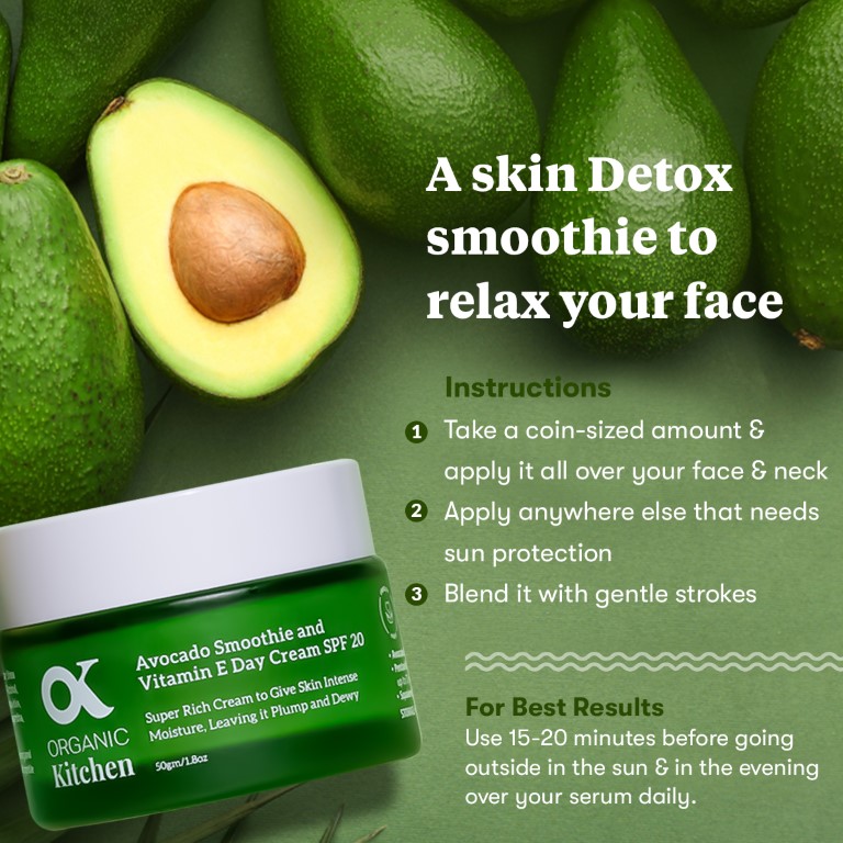 Protect your skin against sun damage from UVA & UVB rays with Avocado Smoothie and Vitamin E Day Cream SPF 20. This avocado, squalene, and vitamin E ingredients infused day cream have SPF 20 that gives a broad spectrum of sun protection to your skin while preventing premature aging signs. This lightweight, deep hydrating day cream has anti-oxidant & anti-inflammatory powers that boost the hydration level of the skin.
