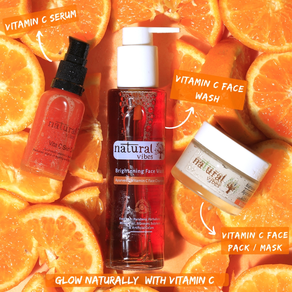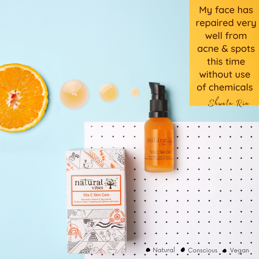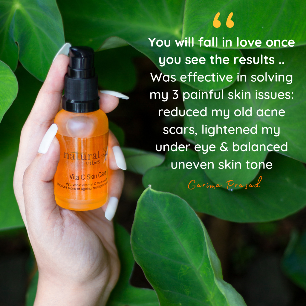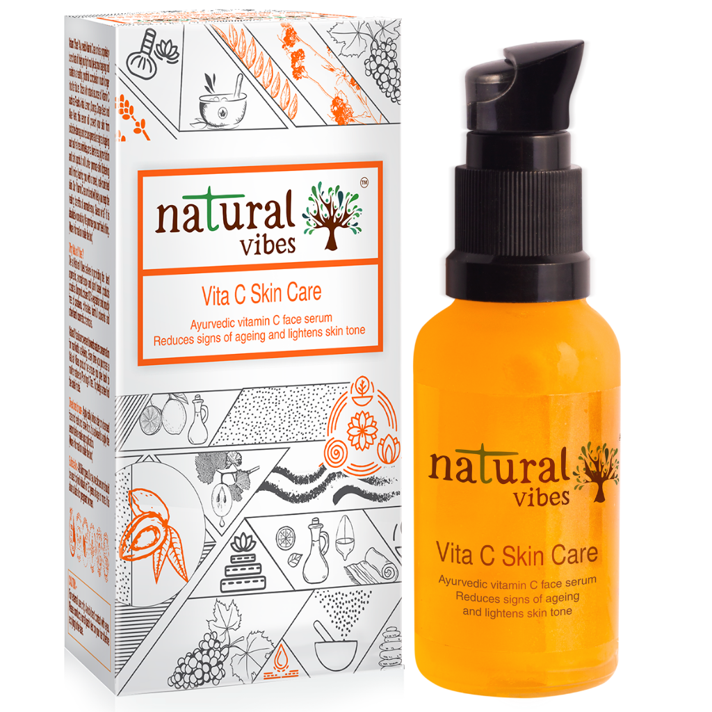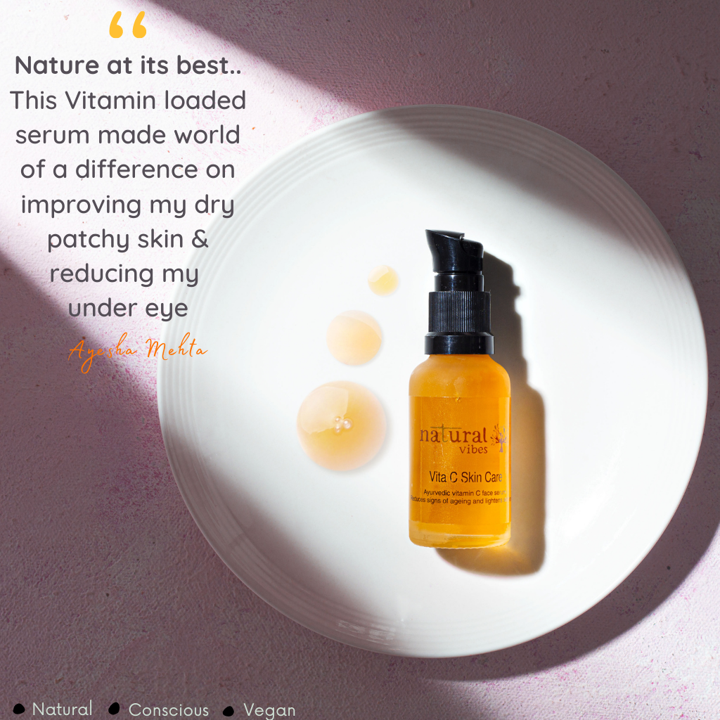 Natural Vibes Ayurvedic Vitamin C serum is a proprietary blend that will help you fight multiple signs of ageing and maintain a healthy, youthful complexion much longer into the future. Made with natural sources of Vitamin C such as Peach, Amla, Lemon, Orange, Grape Seed and Aloe Vera, this serum will prevent your skin from oxidative damage and reduce premature signs of ageing such as fine lines, wrinkles, acne, blemishes, pigmentation and dark spots. It will further promote skin lightening and firming leaving you with toned, well-nourished skin. Our Vitamin C serum blend will help you reap the healing benefits of aromatherapy. Guess what? It is absolutely non-sticky. We promise you won't feel a thing.