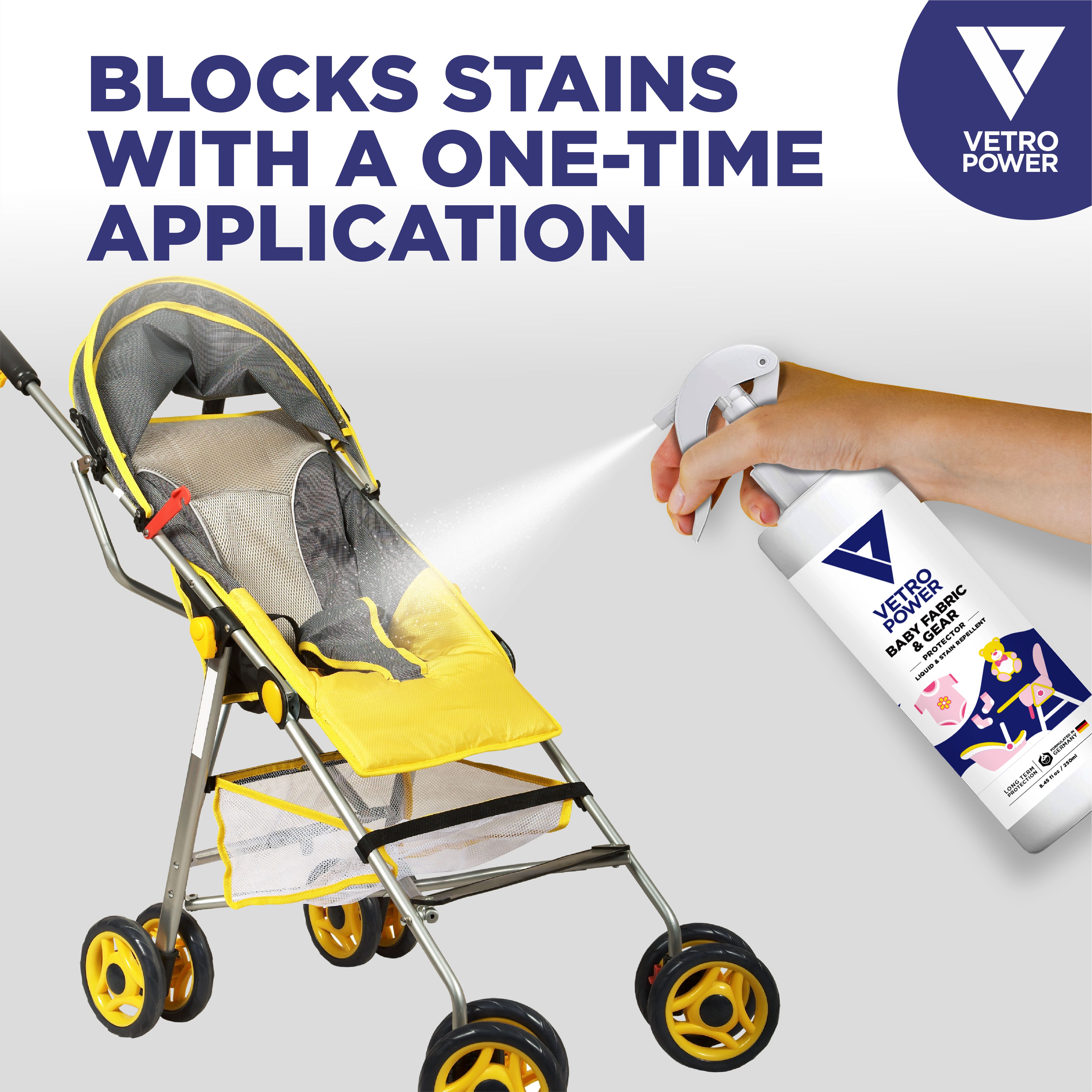 Baby Fabric & Gear Protector Spray Protector Spray is an innovative product designed to provide protection and enhance the durability of various fabrics and clothing items. This advanced formula creates an invisible shield that repels liquids, stains, and dirt, keeping your fabrics cleaner for longer periods. The spray is formulated using state-of-the-art nanotechnology, which allows it to penetrate deep into the fabric fibers and create a protective barrier. This barrier prevents liquids and stains from seeping into the fabric, making it easier to clean and maintain the appearance of your clothing and other fabric items. Vetro Power Fabric & Clothing Protector Spray is suitable for use on a wide range of fabrics, including clothing, upholstery, curtains, carpets, and more. It is safe to use on both natural and synthetic fibers, ensuring that your favorite items remain protected regardless of their composition. One of the key features of this spray is its long-lasting effectiveness. Once applied, it forms a durable coating that can withstand multiple washes and wear, ensuring continuous protection. This makes it an ideal choice for high-traffic areas or frequently used clothing items that are prone to spills and stains. The spray is colorless and odorless, so it won't alter the appearance or scent of your fabrics. In summary, Vetro Power Fabric & Clothing Protector Spray is a cutting-edge solution for protecting and preserving the quality of your fabrics and clothing items. With its advanced formula, long-lasting effectiveness, and easy application, it provides an excellent solution for maintaining the cleanliness and longevity of your favorite fabrics.