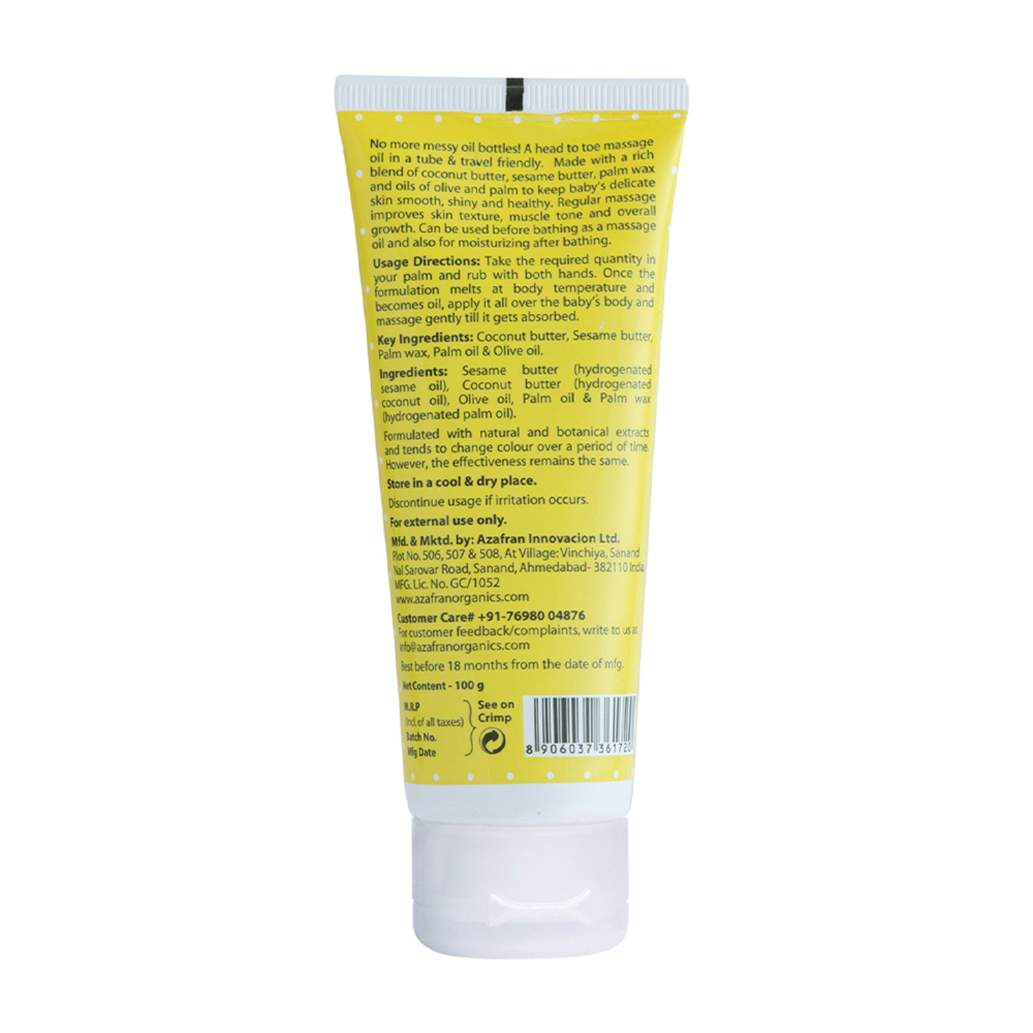 This product is a head to toe massage oil in a tube and is travel friendly. Made from a rich blend of coconut butter, sesame butter, palm wax, olive oil and palm it keeps the baby's delicate skin smooth, shiny and healthy. Regular massage with this product improves skin texture, muscle tone and overall growth. It can be used before bathing as a massage oil and also for moisturizing after bathing.