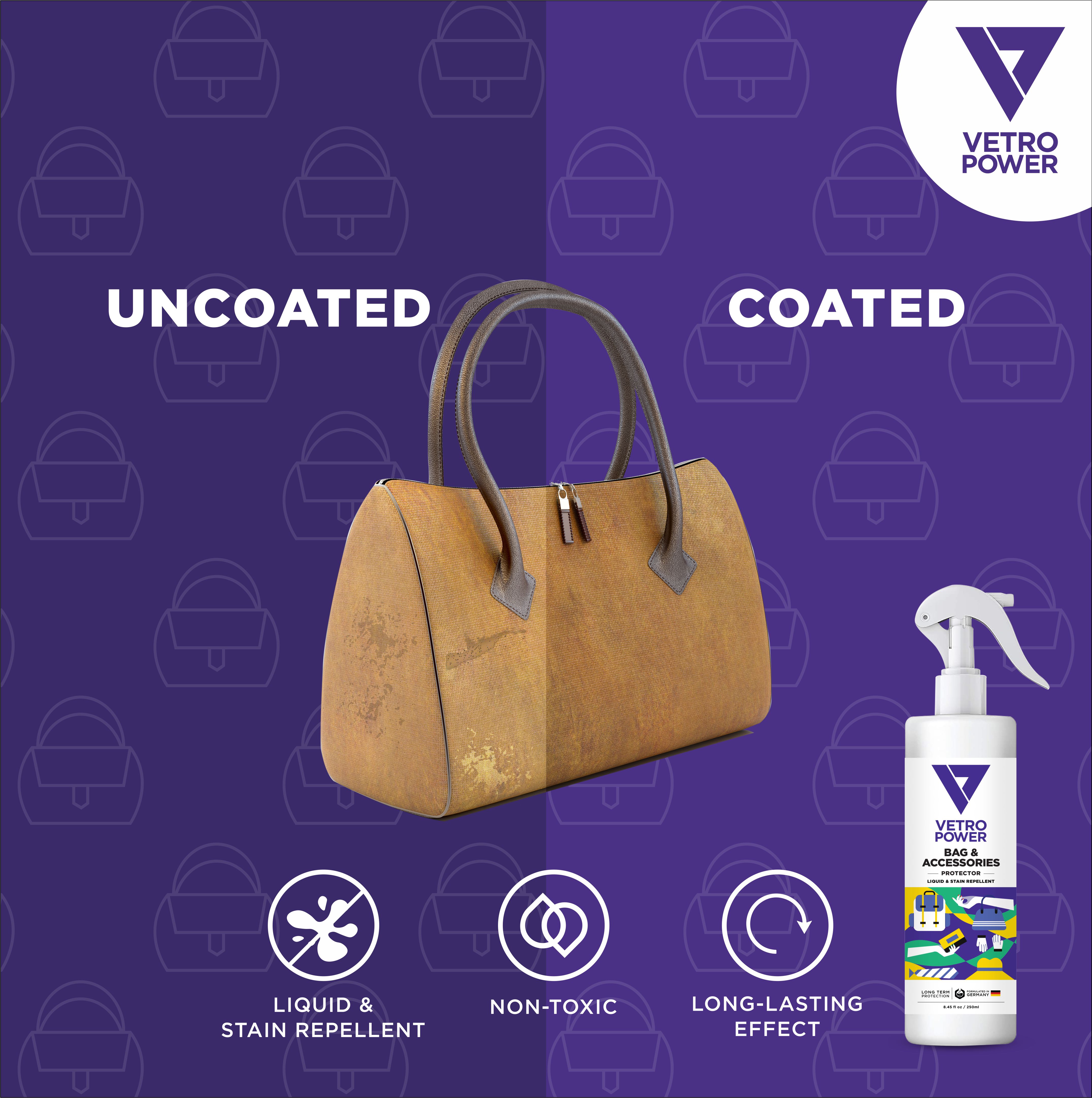 Power Bag & Accessories Protector Spray is a top-quality product designed to provide effective protection for your valuable bags and accessories. This specially formulated spray creates a durable and invisible shield that repels water, stains, dirt, and other common elements, ensuring that your items stay clean, dry, and well-maintained. With a 250 ml bottle, you have ample supply to protect multiple bags and accessories, allowing you to extend their lifespan and keep them looking their best. The spray is suitable for a wide range of materials, including leather, fabric, nylon, canvas, and more. Using the Power Bag & Accessories Protector Spray is a breeze. The Power Bag & Accessories Protector Spray forms an effective barrier that helps prevent water damage and stains. It repels liquids, making spills easier to clean, and also protects against dirt and dust buildup. This helps maintain the pristine appearance of your bags and accessories, prolonging their life and preserving their value. Whether you have a designer handbag, a cherished backpack, or other valuable accessories, the Power Bag & Accessories Protector Spray provides reliable protection and peace of mind. Keep your items looking their best and shielded from the elements with the dependable performance of Vetro Power.