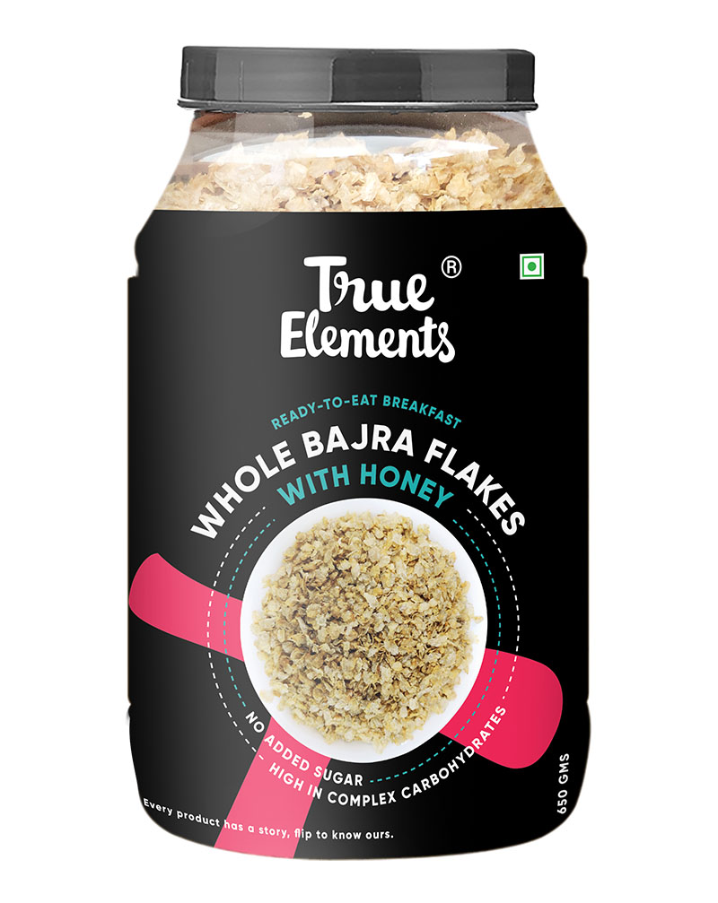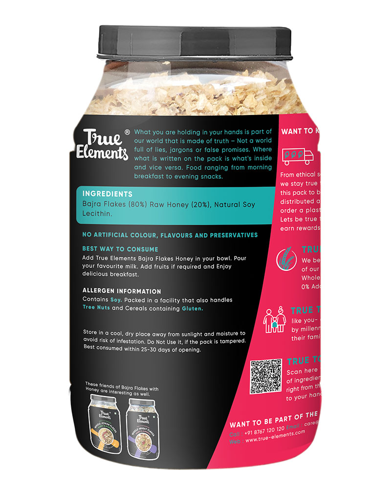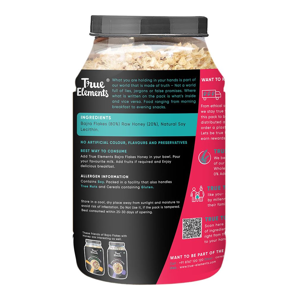 True Elements Bajra Flakes is a quick gluten-free breakfast option which comprises 100% natural Bajra in its purest form. It is rich in micronutrients, fiber and is easily digestible. To make it up to your sweet cravings, it is enriched with the richness of pure raw honey. Bajra Flakes stay crunchier no matter how you consume it, whether you have it with milk or just as a quick grab-on snack. The sweetness and the healthy benefits of Raw Honey make it a perfect breakfast to your boring healthy diet, thereby meeting all your crunchy, tasty breakfast requirements.
