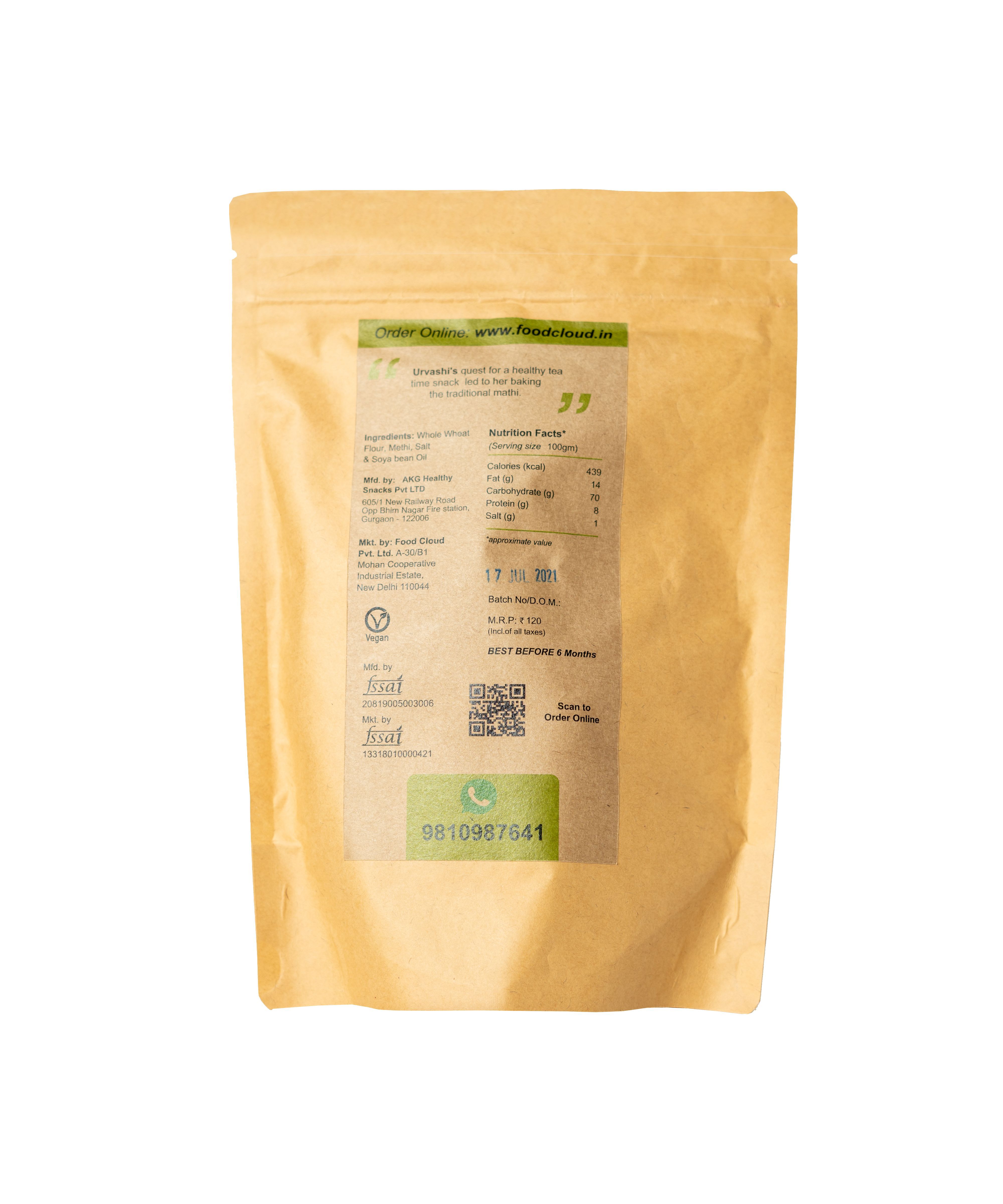 The baked methi mathi is a healthy alternative to a traditional indian snack. It is vegan, homemade & preservative free. It has less fat & less salt compared to the traditional fried version. Since it is baked, it has no trans fat. To ensure that it stays fresh & crisp without frying, it is vaccum packed in small quantities, making it easy to eat on the go, for travelling and as a small mid meal snack. The mathi is flavoured with methi and does not need an accompaniment. It is also a perfect tea time snack. Foodcloud munchies also offers baked mathi in 2 other flavours. The baked mathi is lovingly homemade by a home chef.