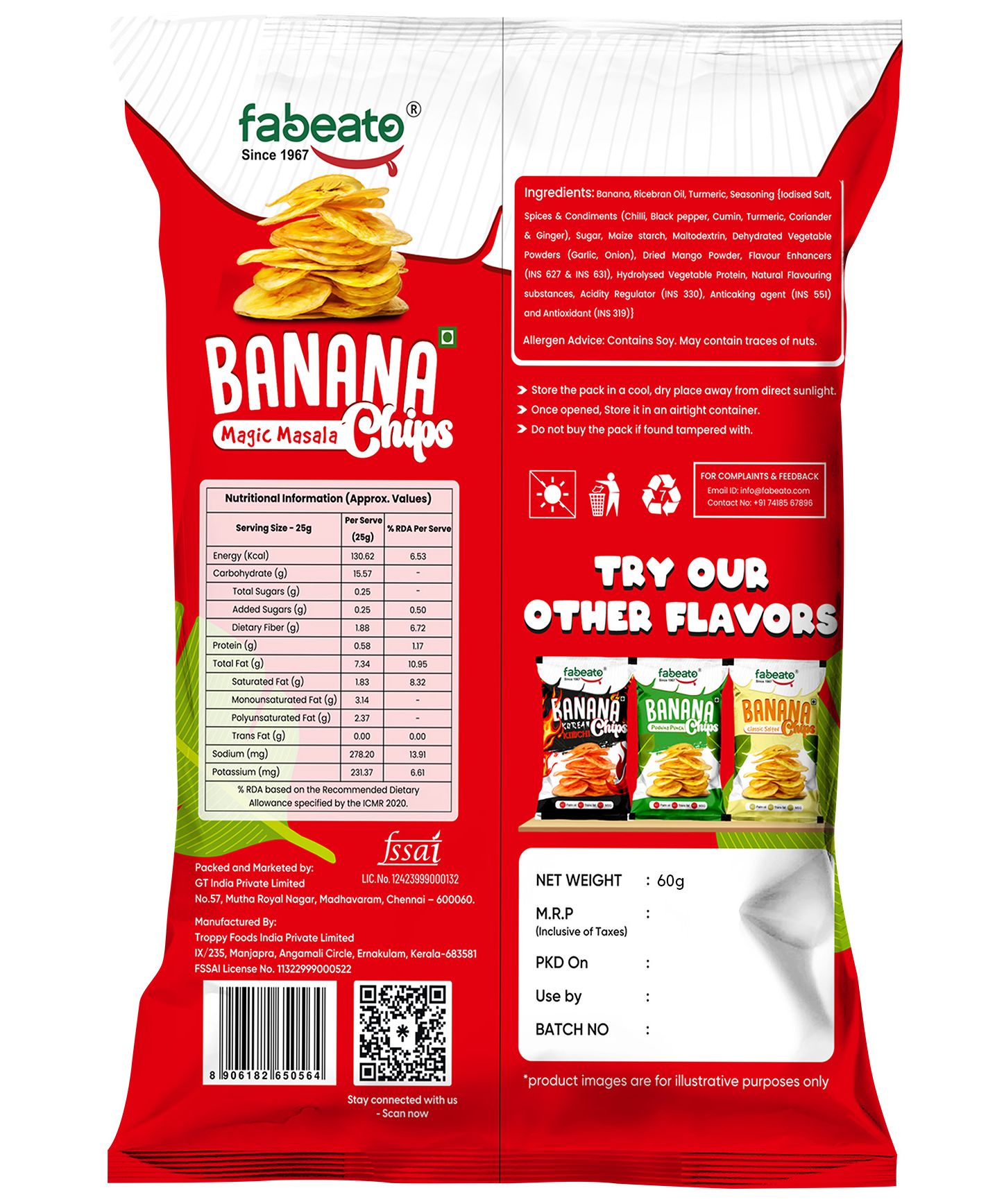 Discover the perfect blend of crunch and spice with Fabeato's Magic Masala Banana Chips! Each 70g pack delivers perfectly sliced banana chips seasoned with an exciting blend of Indian spices that create a tangy, spicy flavour profile. Made without palm oil or MSG, these chips offer a cleaner snacking alternative while maintaining their irresistible taste. The convenient pack of three ensures you always have these crunchy delights on hand. These versatile snacks are ideal for tea breaks, movie nights, or as a flavourful addition to children's lunch boxes. Made from carefully selected bananas that are thinly sliced and expertly fried to achieve the perfect crunch, these chips are naturally rich in MUFA and dietary fibre. Each 25g serving delivers a satisfying snacking experience while maintaining vegetarian-friendly standards. Store in a cool, dry place and once opened, keep in an airtight container to maintain freshness. Whether you're hosting guests or satisfying your own snack cravings, these Magic Masala Banana Chips offer a unique twist on traditional Indian snacking.