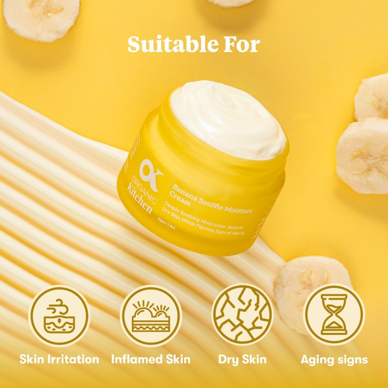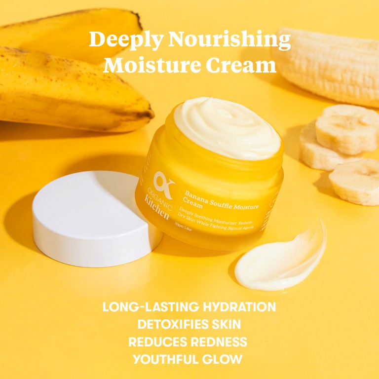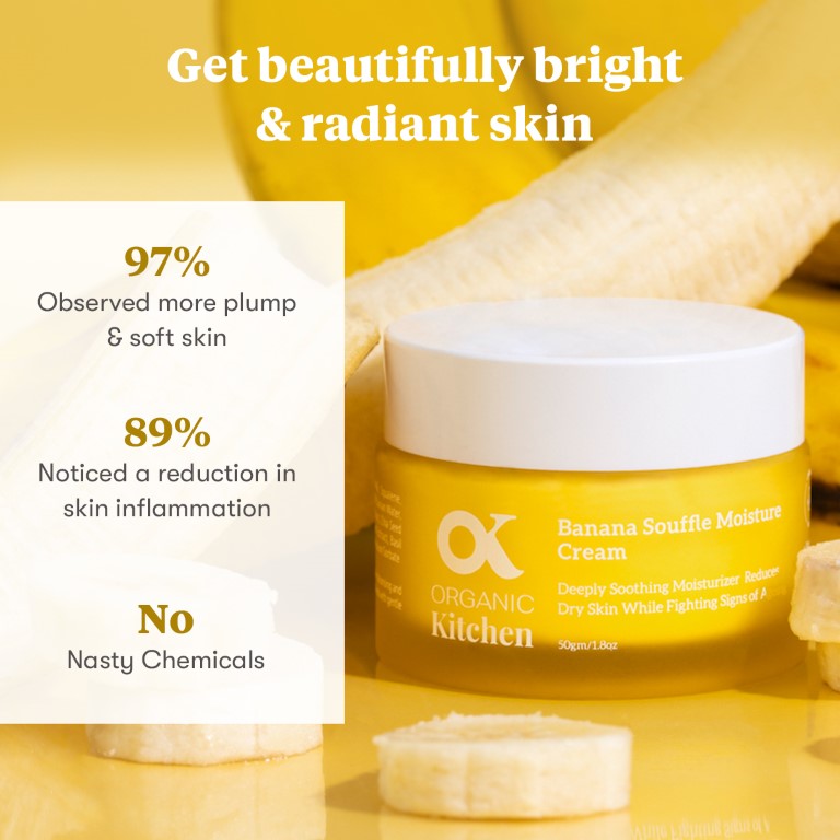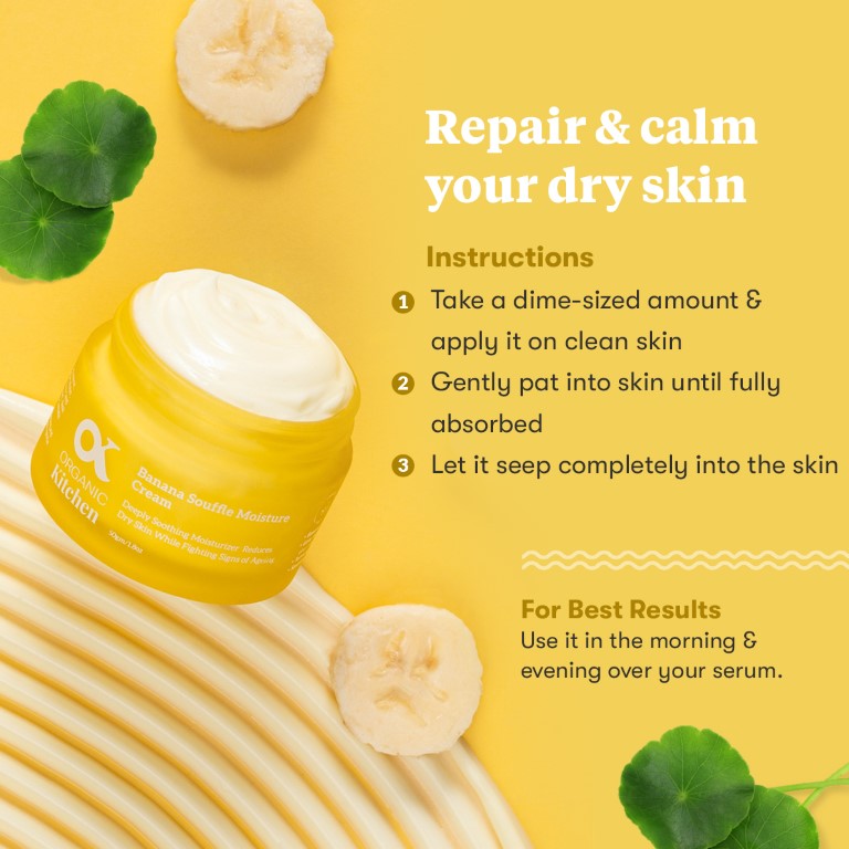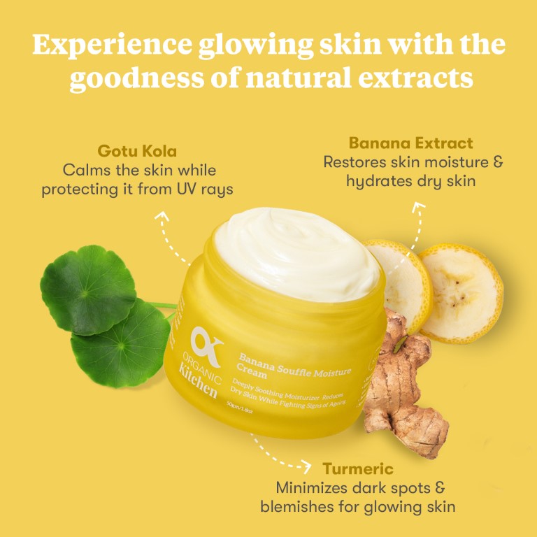 Soothe your dry and dehydrated skin with the goodness of this Banana Souffle Moisture Cream. Filled with Banana, Turmeric, Chia seed, and Coconut extract, as well as potassium and magnesium, this cream has the ability to reset, restore and lock in moisture for a long period of time. Banana and Turmeric extracts help in hydrating and reducing inflammation, while magnesium helps in calming irritated skin. This lightweight, gel-like cream deeply moisturizes, hydrates as well as reduces dark spots and acne scars for clear, smooth skin.