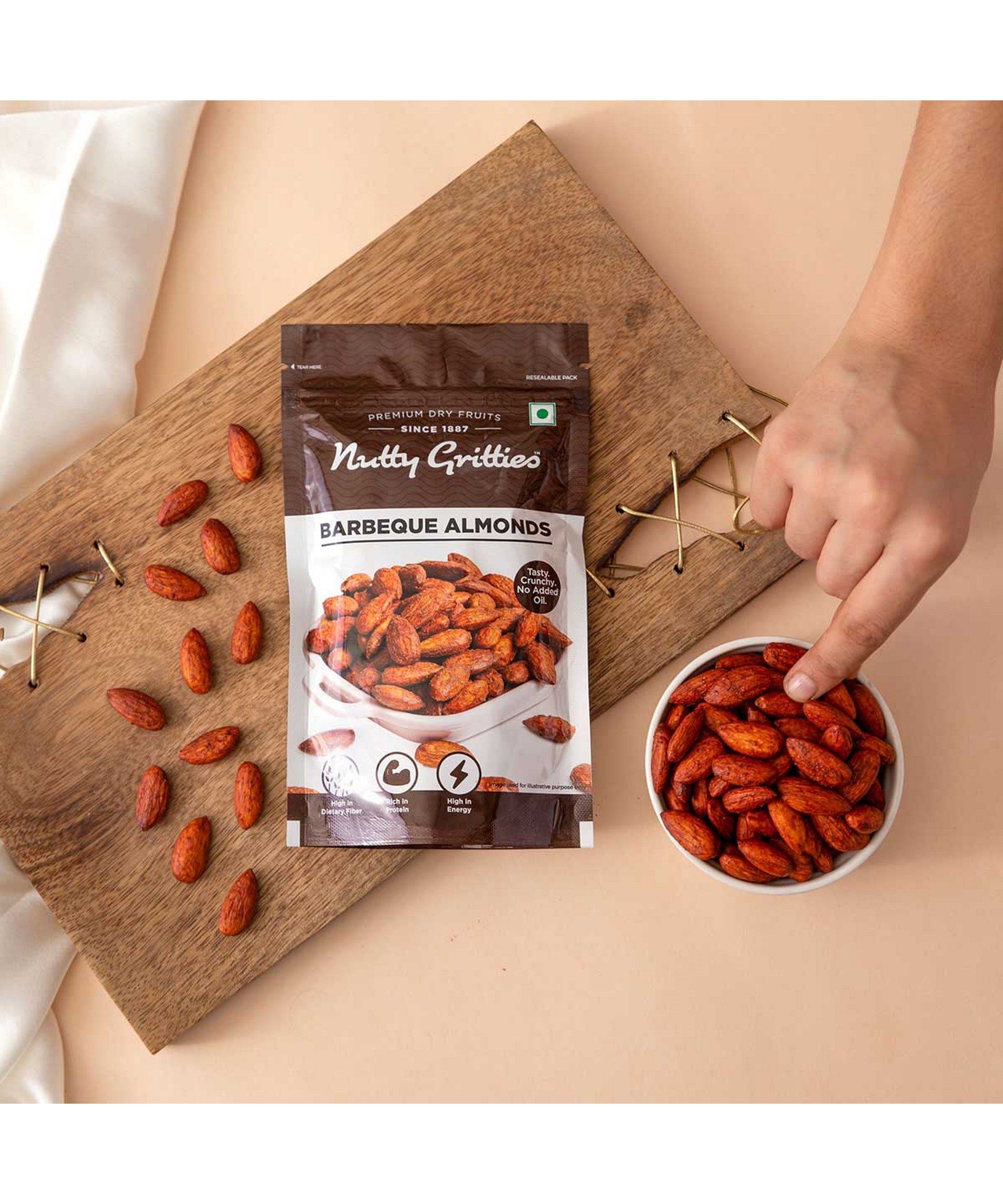 For Barbeque Almonds, our Nutty Kitchen Chefs dry roast big chunks of California almonds with a blend of exotic barbeque spices. The result is a flavourful, playful and delightful combination of joy and all smiles. They undergo a special dry roasting process in the Nutty Kitchen with a blend of our special exotic barbeque spices, a hint of paprika and zero oil. Packed in their whole, barbequed, skin-on avatars, they have a crunchy texture with undernotes of barbequed goodness. Barbeque Almonds are a powerhouse of nutrition those chunks arent just big in size; they are big on health too. Each handful serving portion packs 6.2 g of protein, 12 g of good fat, and a good amount of magnesium, calcium, iron and Vitamin E.