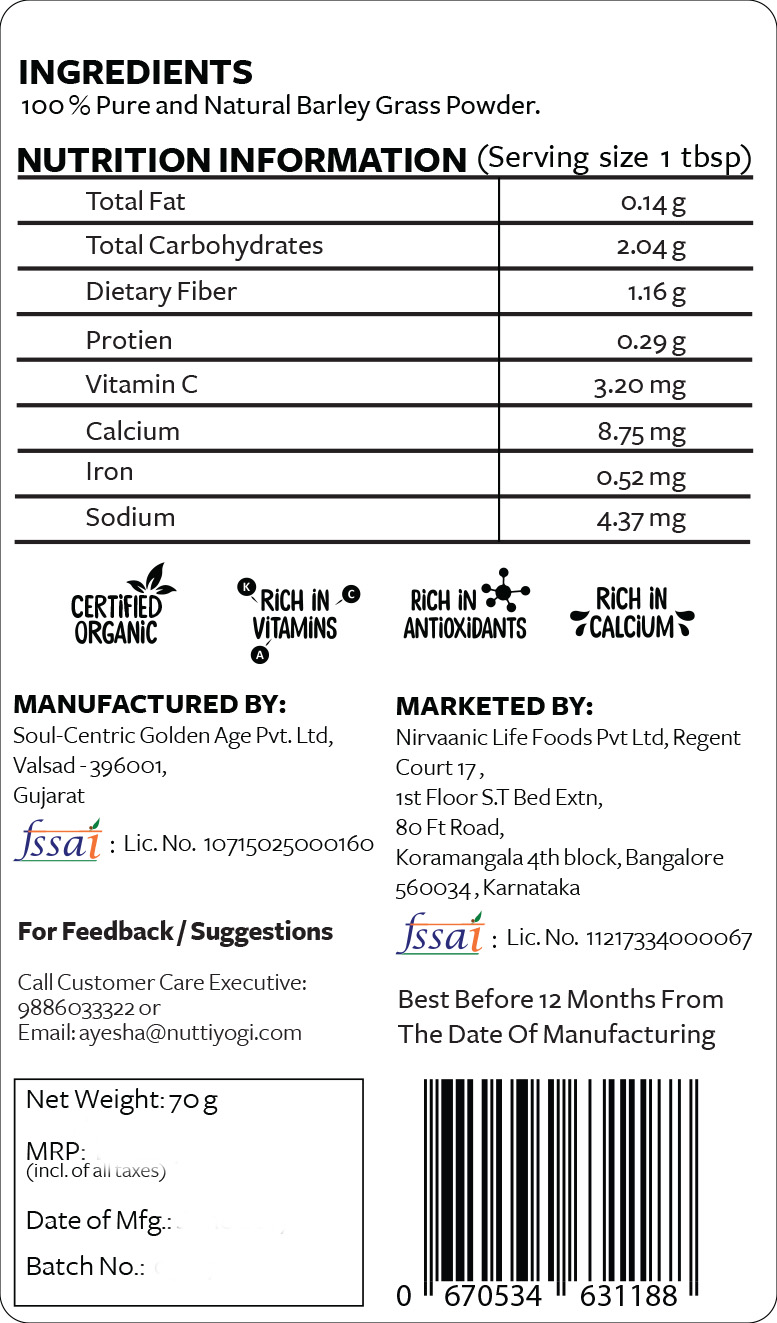 Barley grass is made from the young shoots of the barley plant. When cut, it is a reservoir of minerals as well as being rich in vitamin e and proteins. It also helps in the protection of body cells from oxidative stress. Just one serving of barley grass, has more than a third of your recommended intake of iron which supports red blood cell formation and oxygen transport around the body. Enjoy nutty yogis barley grass as a part of leading a healthy lifestyle and a balanced diet. 100% pure and natural barley grass powder. The nutty yogi barley grass powder blends smoothly into variety of drinks or can be added to cold or hot cereals, yogurt and salad dressings.