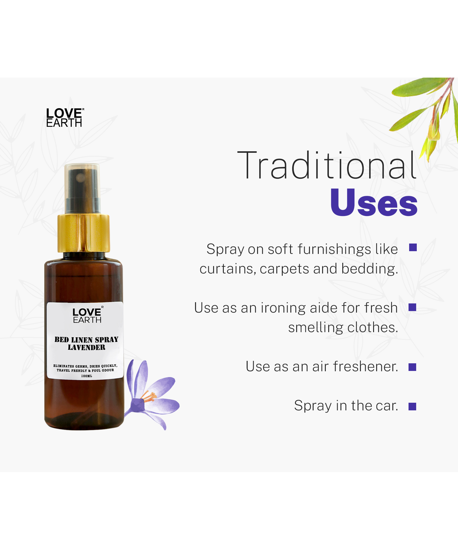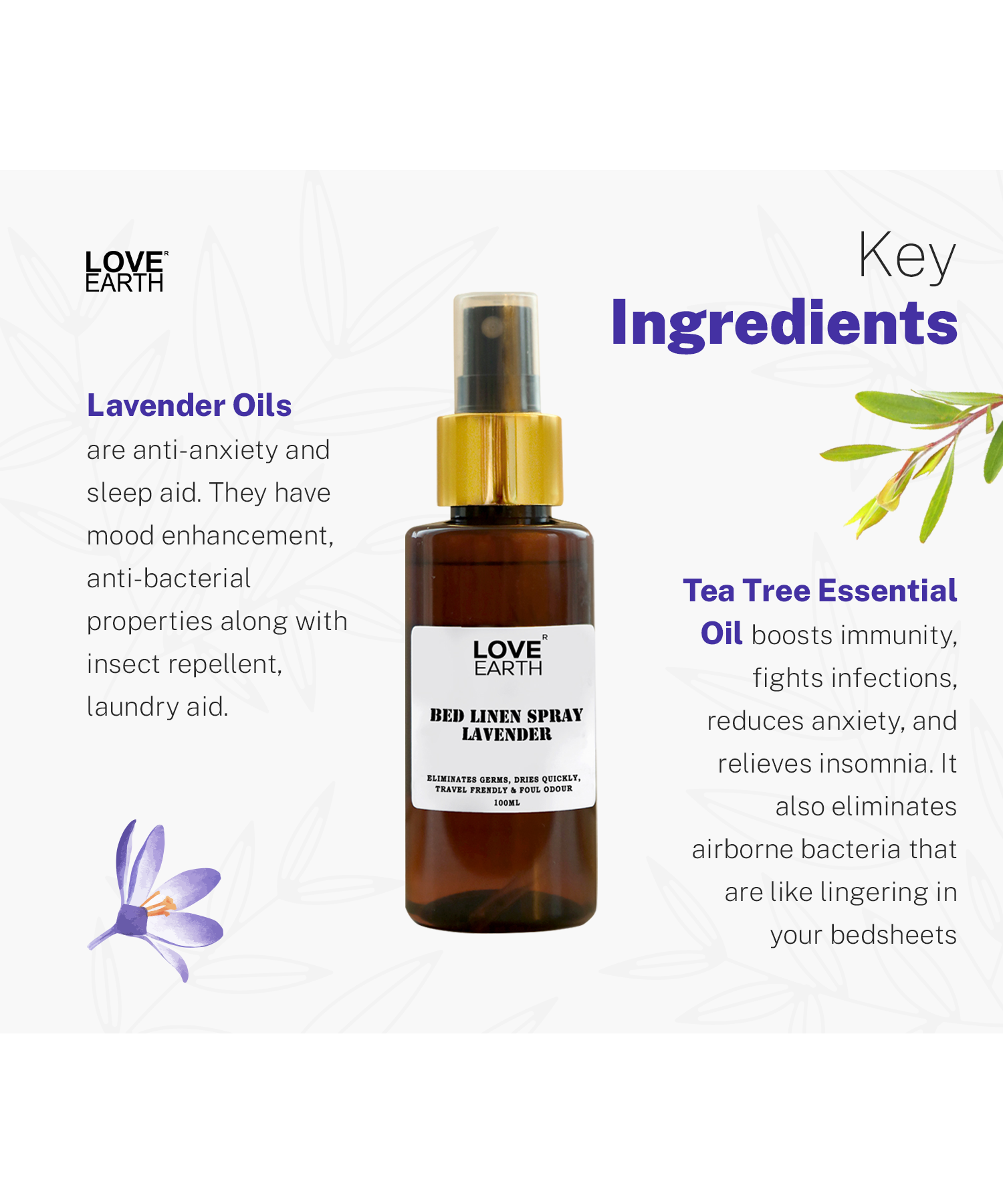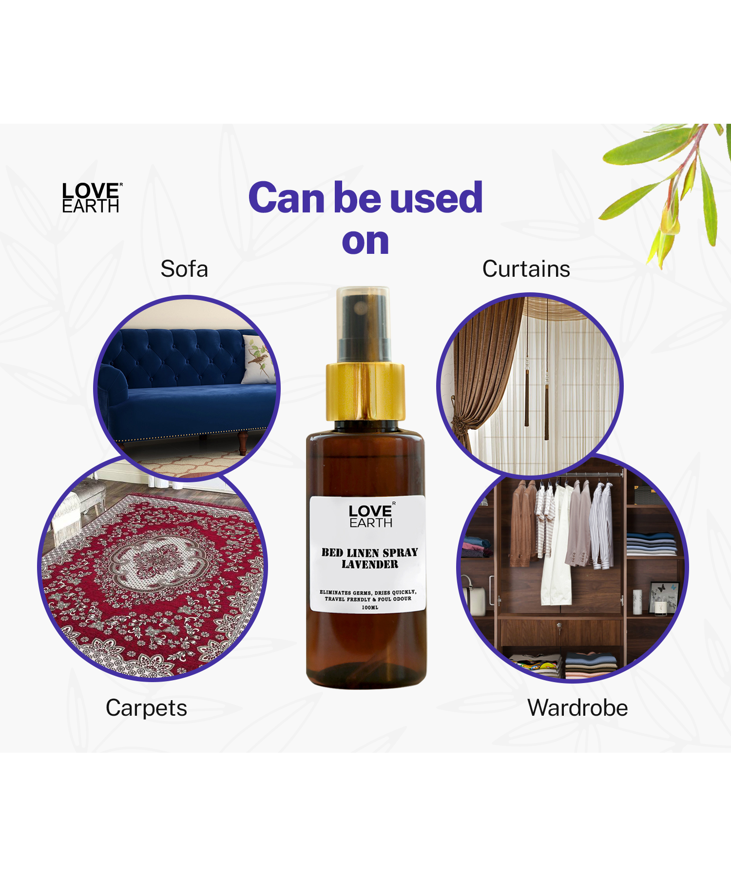 Well, you are right!! No one wants one of those stinky bedsheets. And that's why you are a genius because you are here buying our Love Earth Bed Linen Spray. This fierce product of ours eliminates germs and all sorts of foul odour. It also dries quickly. And on top of that, it is very travel friendly. It comes with a beautiful Lavender fragrance which helps in making your surroundings breathable. This product of ours can be used on all soft furniture like sofas, curtains, bedsheets, pillows, etc. You are going to finally have a safe and sound sleep tonight after a few sprays of this. Enjoy, you beautiful human.
