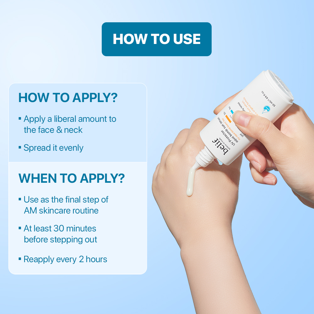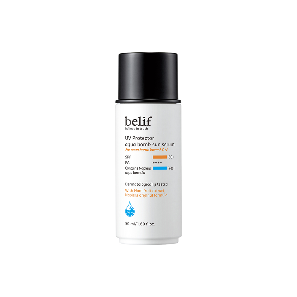 belif UV Protector Aqua Bomb Sun Serum SPF 50+ PA++++ is your go-to moisturizing sunscreen. It blends Aqua Bomb's hydration with powerful sun protection. This sun serum brightens, fights wrinkles, and shields from harmful UV rays. Infused with the Napiers aqua formula, it hydrates, protects and feels refreshing on the skin, without feeling greasy and leaving a white cast.