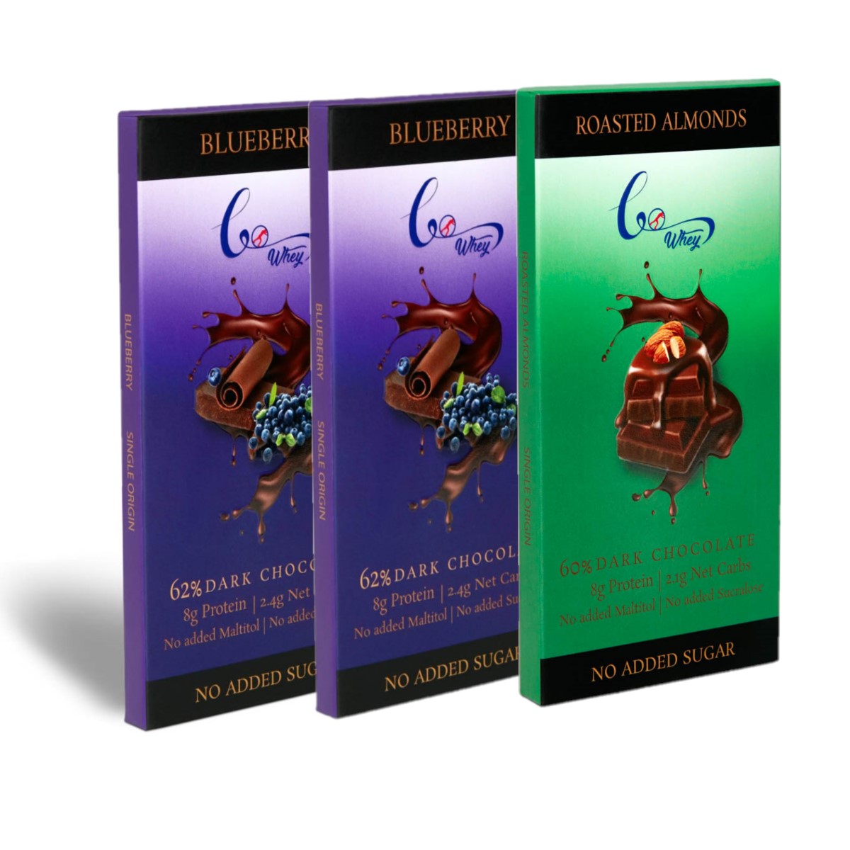 Gowhey Berry Almond Dark Chocolate Bars (2 - 62% Blueberry Bars, 1 - 60% Roasted Almond Bar) 50gm each (Pack of 3)