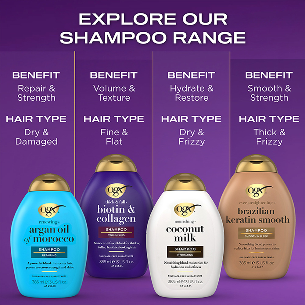 "SMOOTH HAIR THE WAY NATURE INTENDED: OGX Ever-Straightening + Brazilian Keratin Therapy Hair-Smoothing Shampoo hydrates strands, leaving them extra-glossy with a lustrous shineSOFTER, SILKIER, STRONGER: No matter the hair type, this nourishing keratin shampoo strengthens and softens hair while helping smooth the cuticle for strong, long tresses