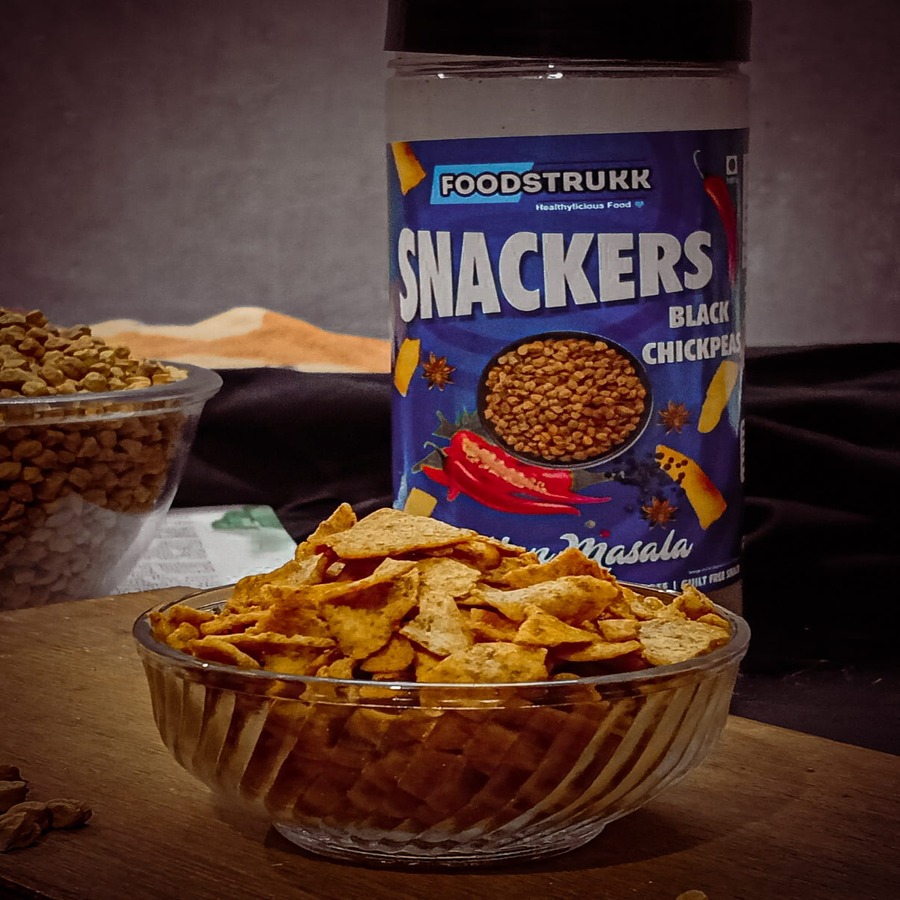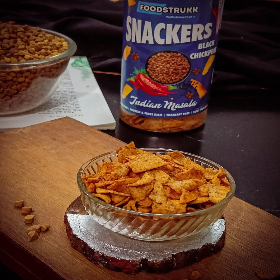 Foodstrukk Black Chickpeas with Indian Masala Snackers are a new way of eating chips without guilt. A perfect healthy alternative to eating potato chips. Our snackers are made from millets and superfoods and contain no chemicals, preservatives, hpv, or junk. All our products are clean label and are made from only organic and natural ingredients.